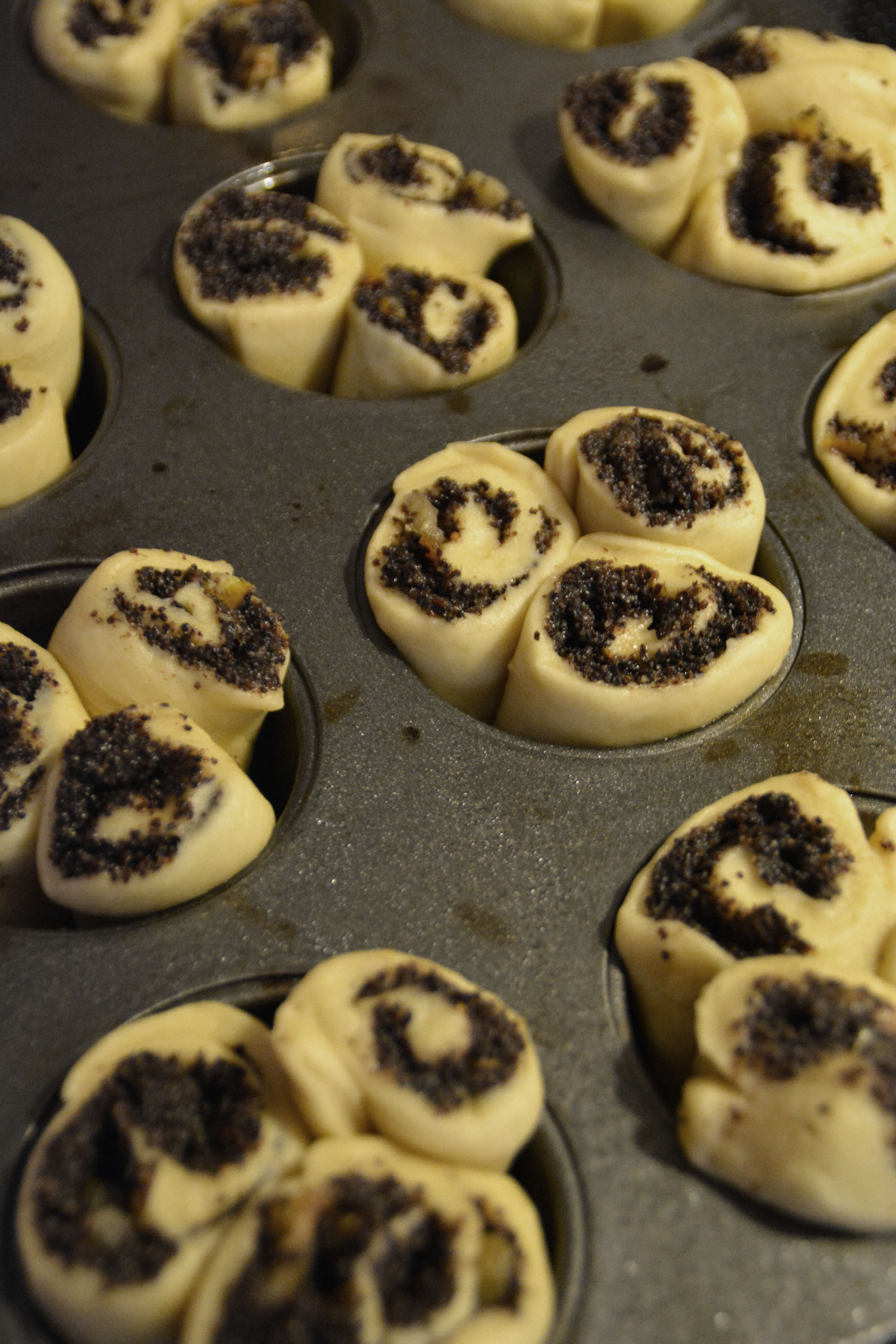 Spre valmue fyllet på hver av rektangler og rull på langs. Deretter kutt i 4 cm biter og legg tre sammen i hver, smurt, hull i muffinsformen.