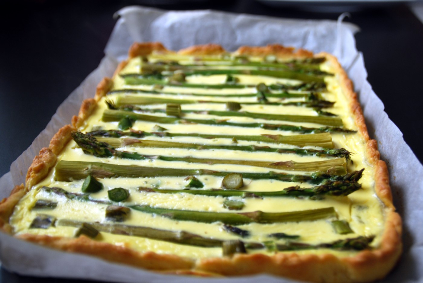 Hell egg og fløteblandingen i bakt quiche. Legg asparges og eventuelt kan du også ha litt mer ost på toppen.