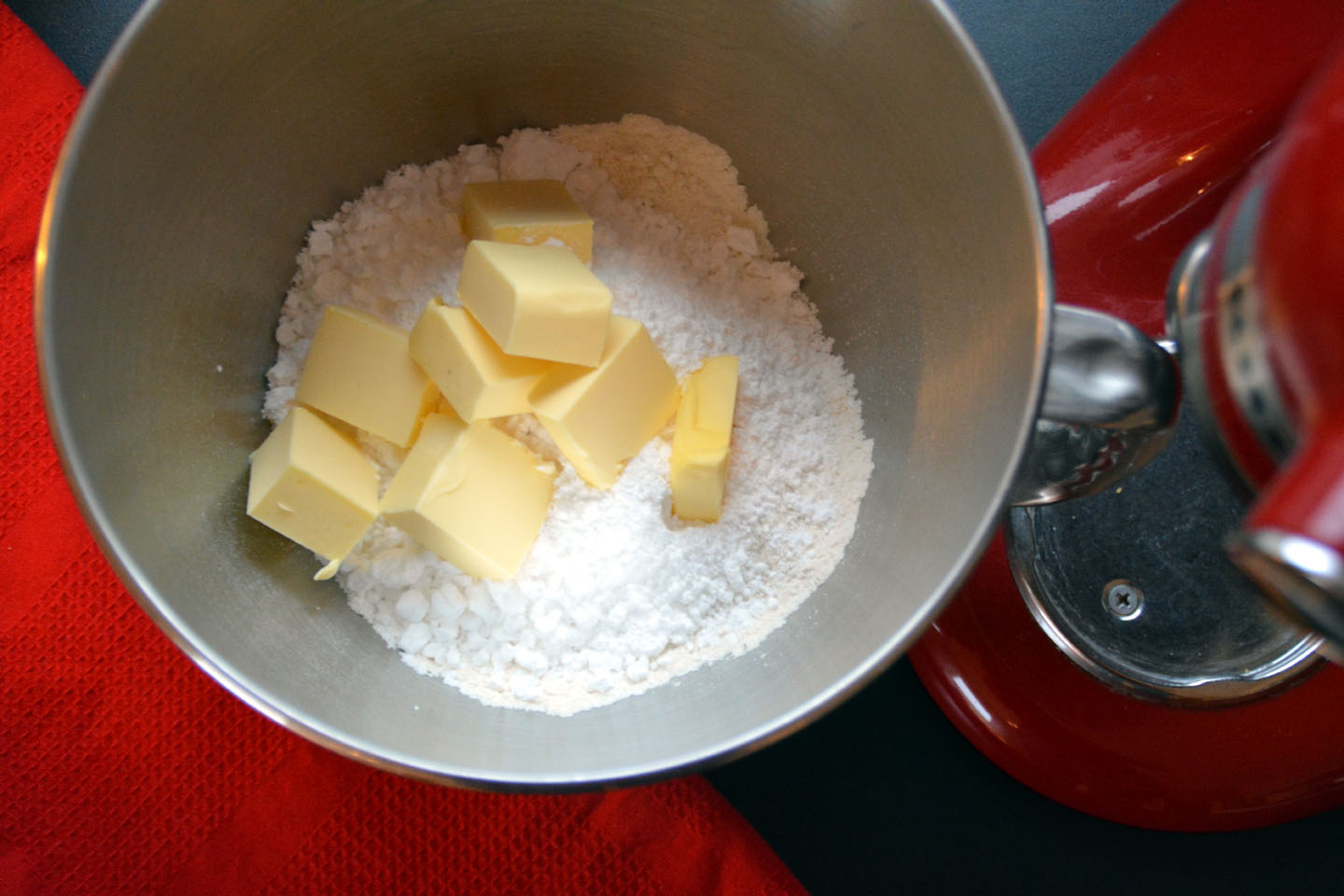 Sikt sammen mel og salt. Skjær smøret i små biter og ha det i. Tilsett sukker blandet med egget så elt deigen til jevn.