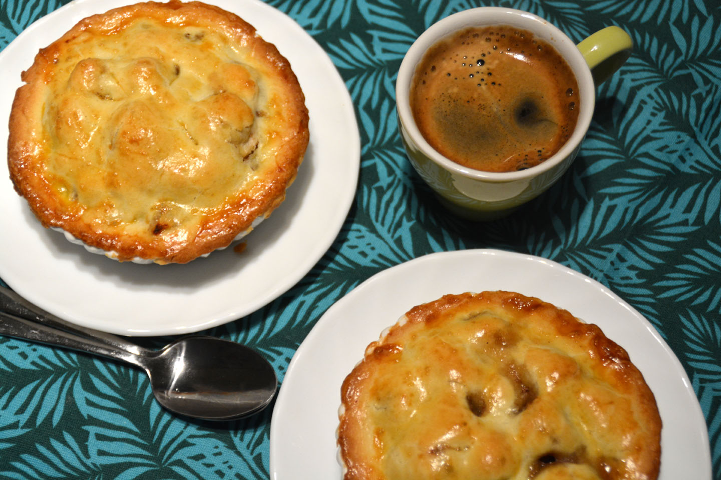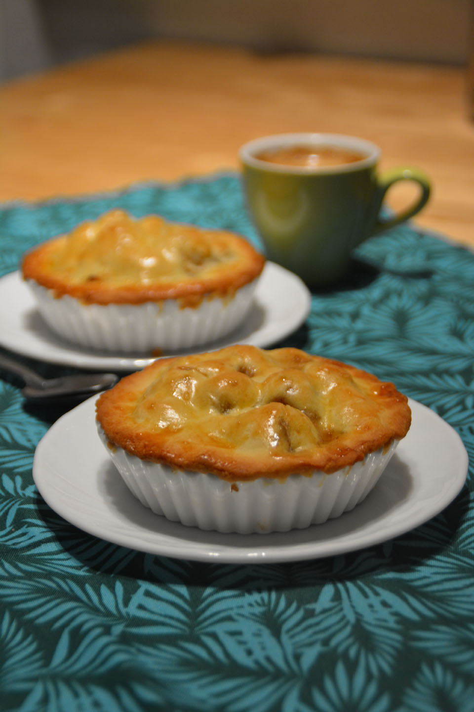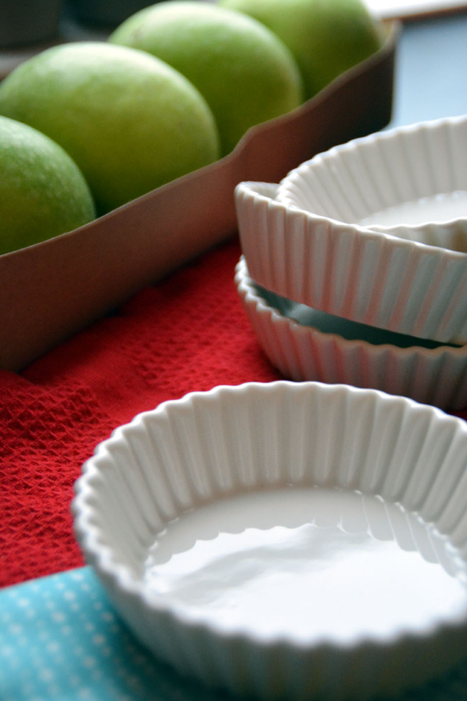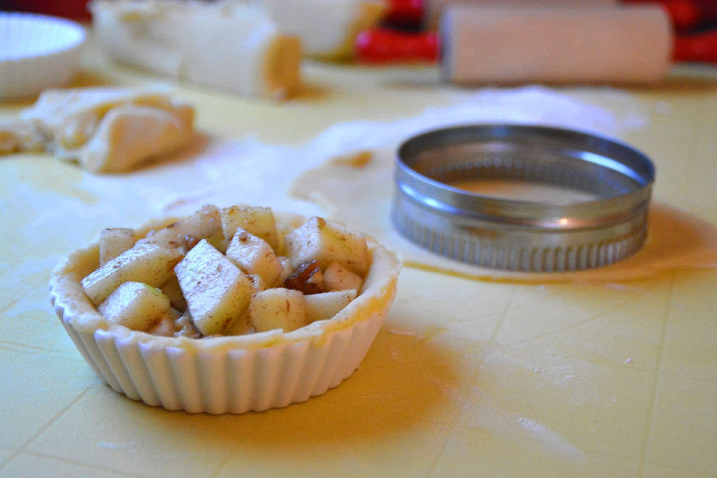 Kjevl ut halvparten av deigen, kutt ut sirkler med diameter passende til dine pai former, leg de sirklene i smurte formene. Legg eplene i, fukt kanten av deigen for å gjøre en god tetning med lokket.