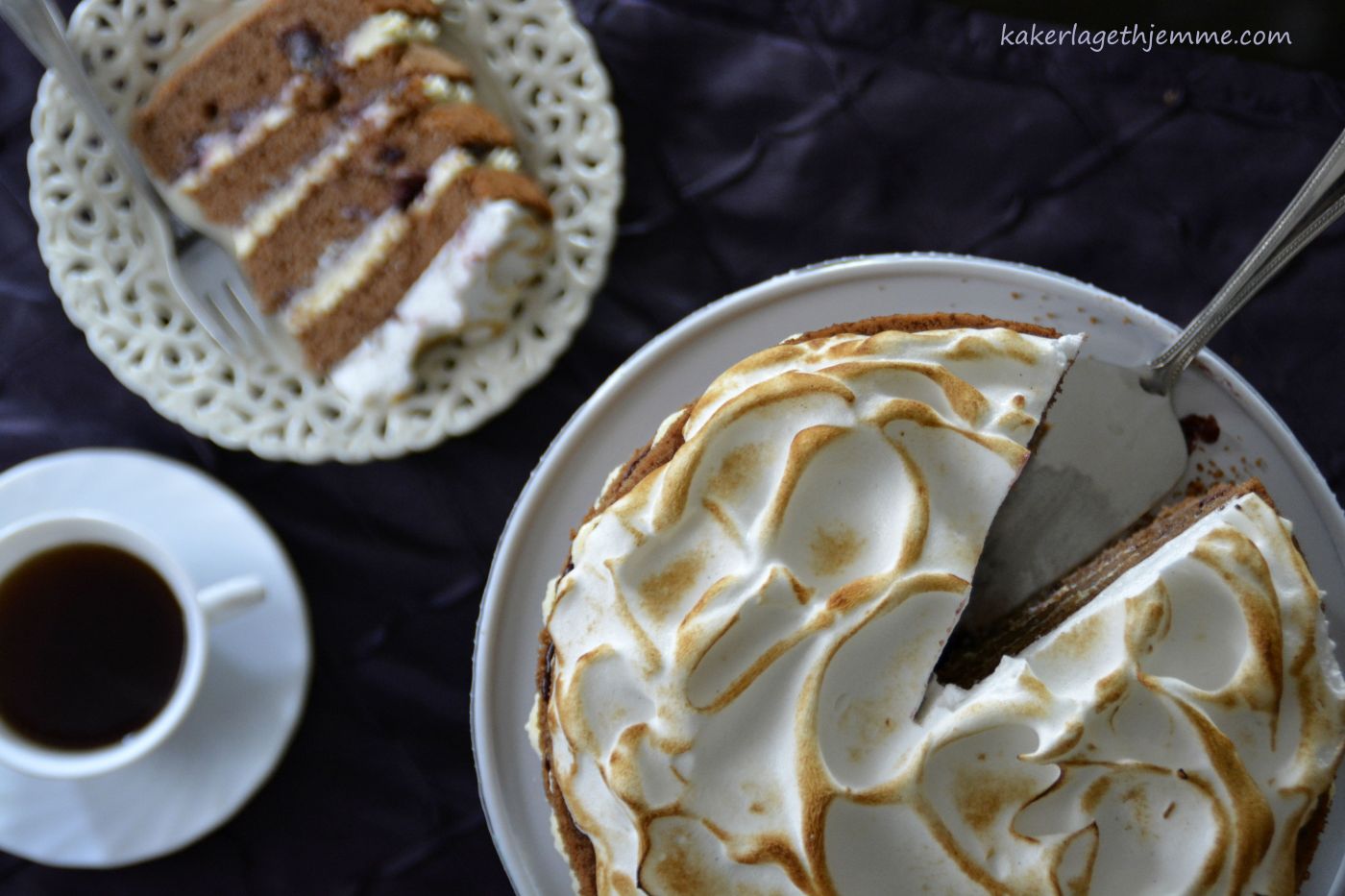Del hver av kakene i to like deler og bygg opp kake med fire lag: først spre tynt med solbær syltetøy så kremen på hvert nivå. Toppen av kaken skal pyntes med hvit frosting.