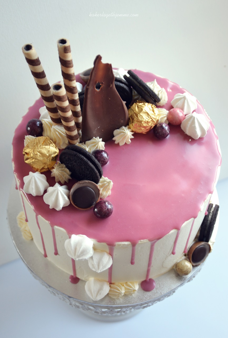 - noen søtsaker, sjokolade, marengs og ferrero rocher til å dekorere toppen av kaken med.