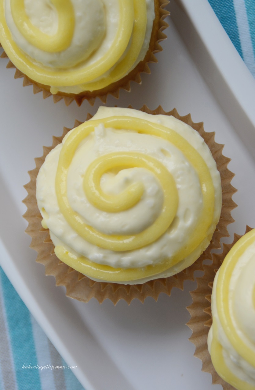 Bruk sprøytepose for å pynte muffins og en annen sprøytepose med et smal tipp for å lage en lemon curd virvel på muffinser.