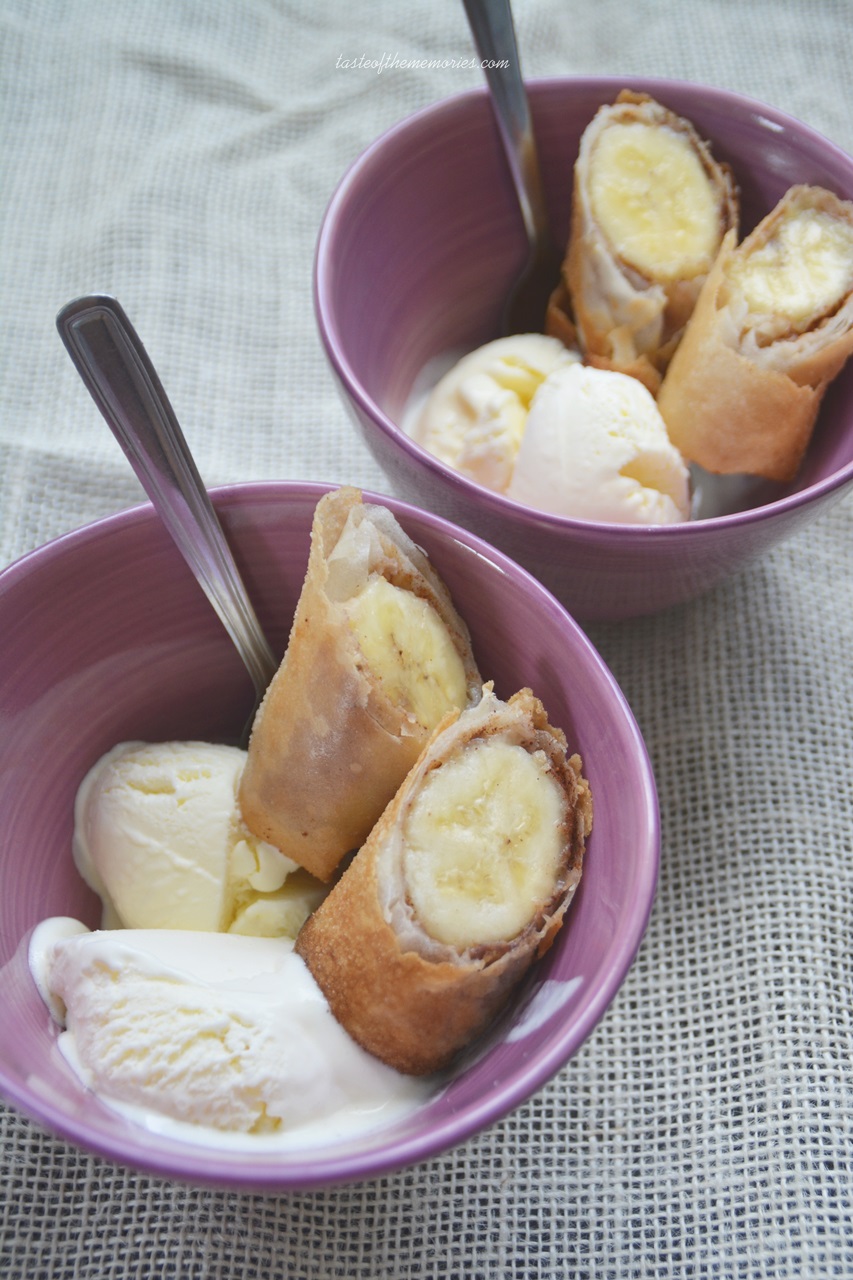 Stek noen banan ruller om gangen i varm olje til jevnt brunet. Flytt til papirhåndklær til å renne.