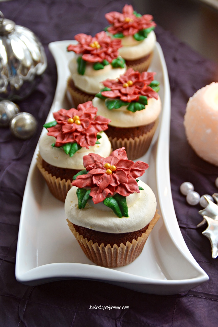 Bruk sprøytepose for å dekorere muffinser med kremen dekorér deretter som du ønsker, jeg forberedte smørkrem Poinsettia-blomster/julestjerne på forhånd og dekorerte cupcakes med de blomstene som minner meg så mye om jul, som det er mange som bruker blomsten til å dekorere hjemmet i denne tiden av året.