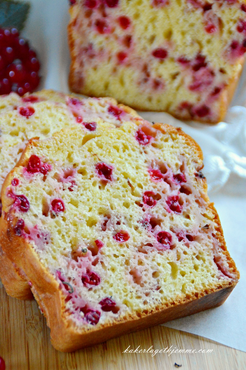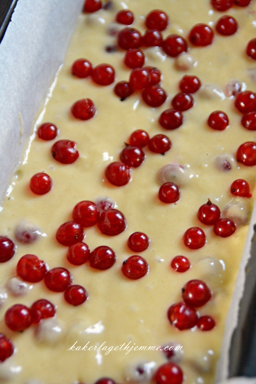 Bland 1 ss melet med ripsene i en bolle og tilsett til røren, bland forsiktig et par ganger med en slikkepott. Hel røren i bakeformen og sett i forvarmet til 180 grader C ovnen, stek i 40-50 minutter.