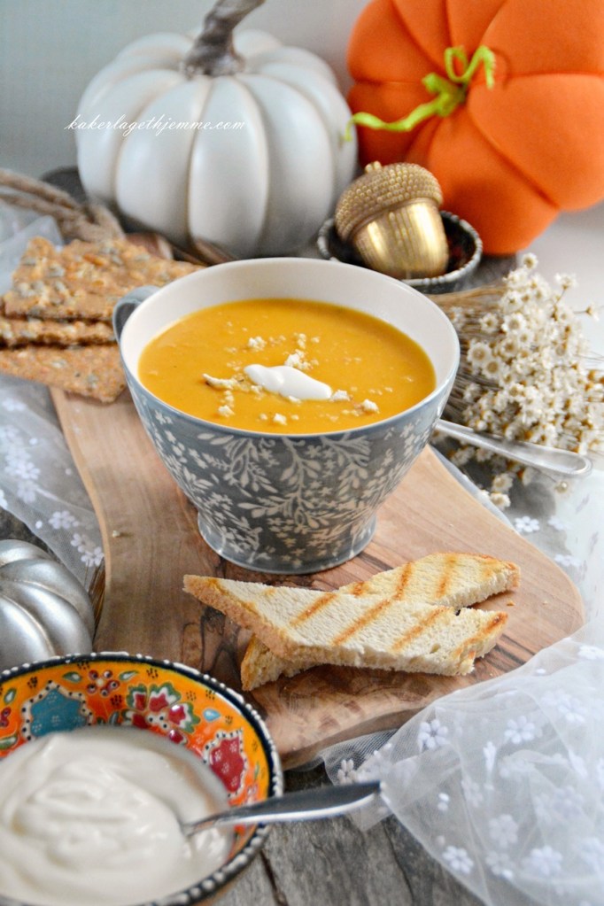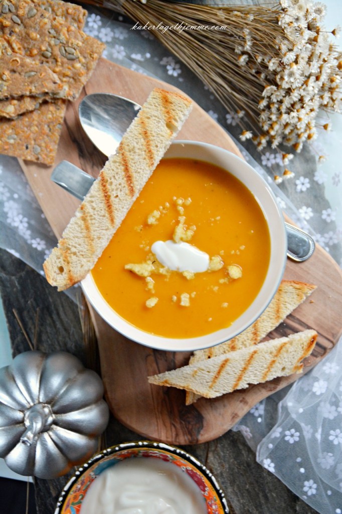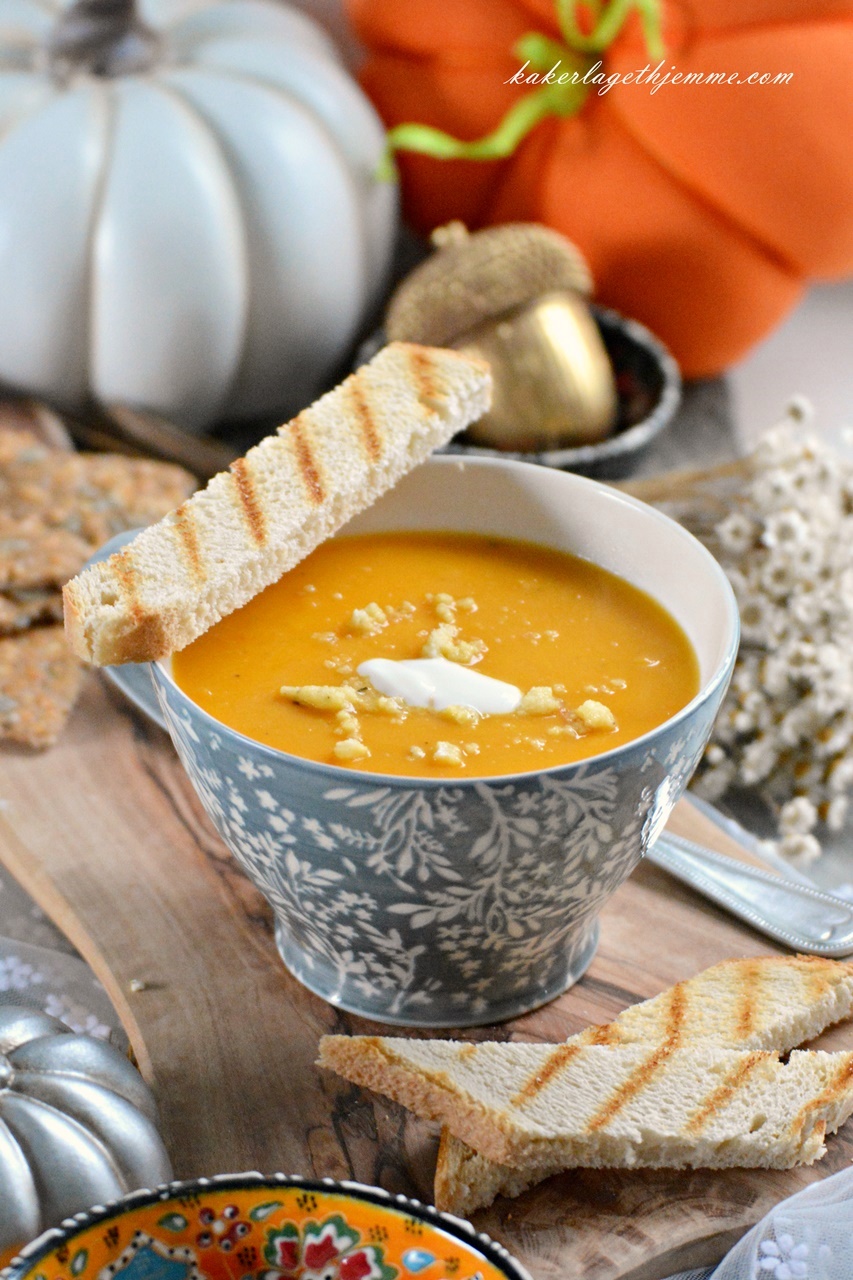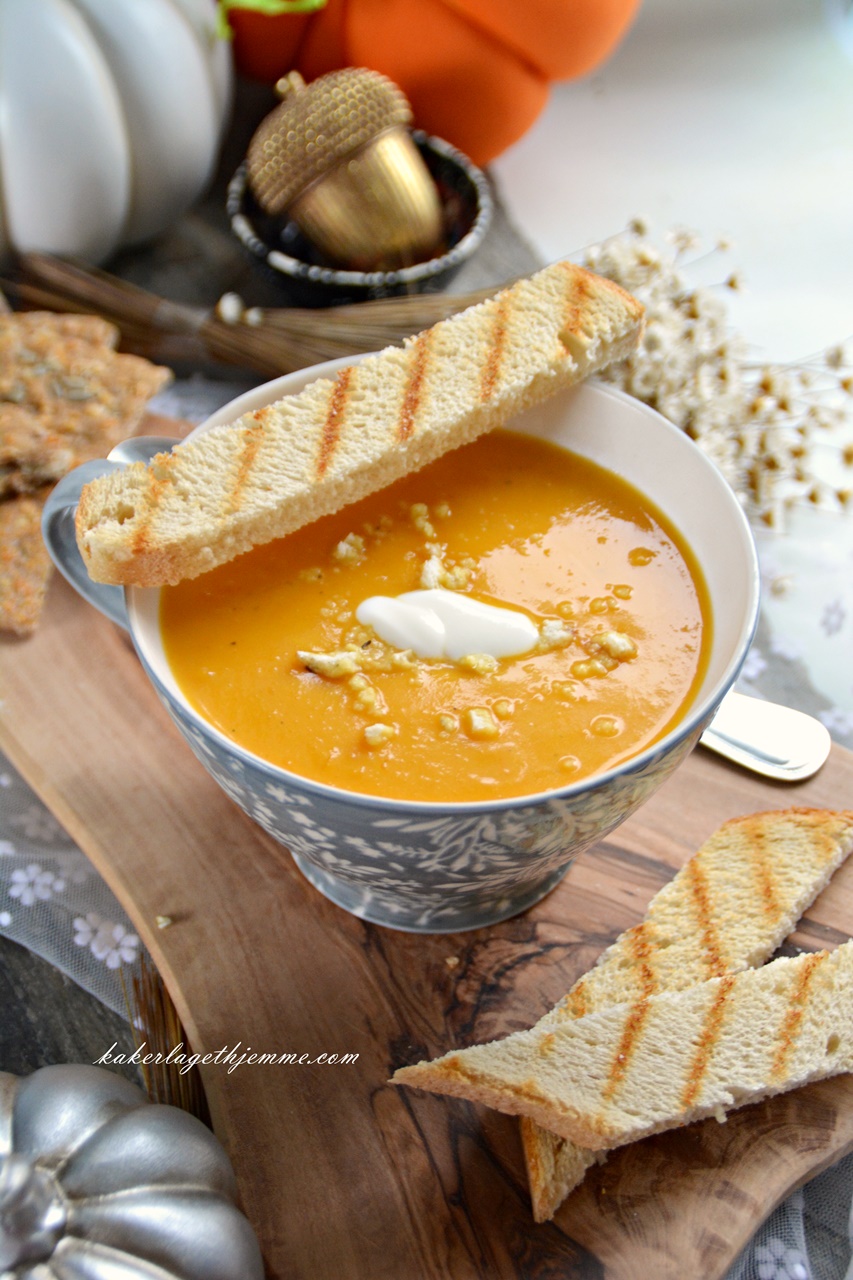 Enkel hjemmelaget flaskegresskar suppe naturlig tykk og kremaktig, perfekt for høst sesongen. Laget med litt gulrot og krydret med kajennepepper er søt og sterk i smaken, så perfekt for kjølige kvelder. Nyt gjerne suppa med ristet brød eller hvitløksbaguette.