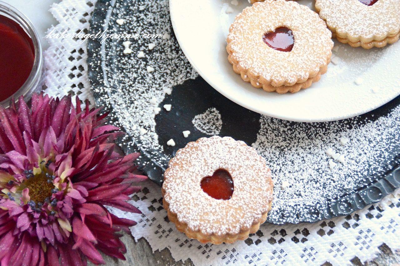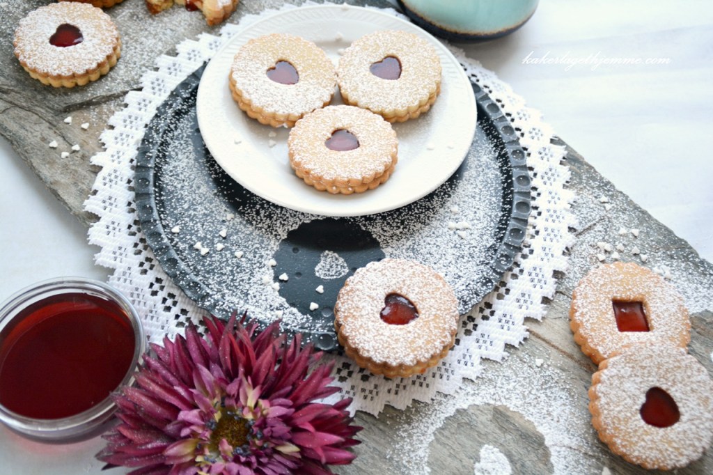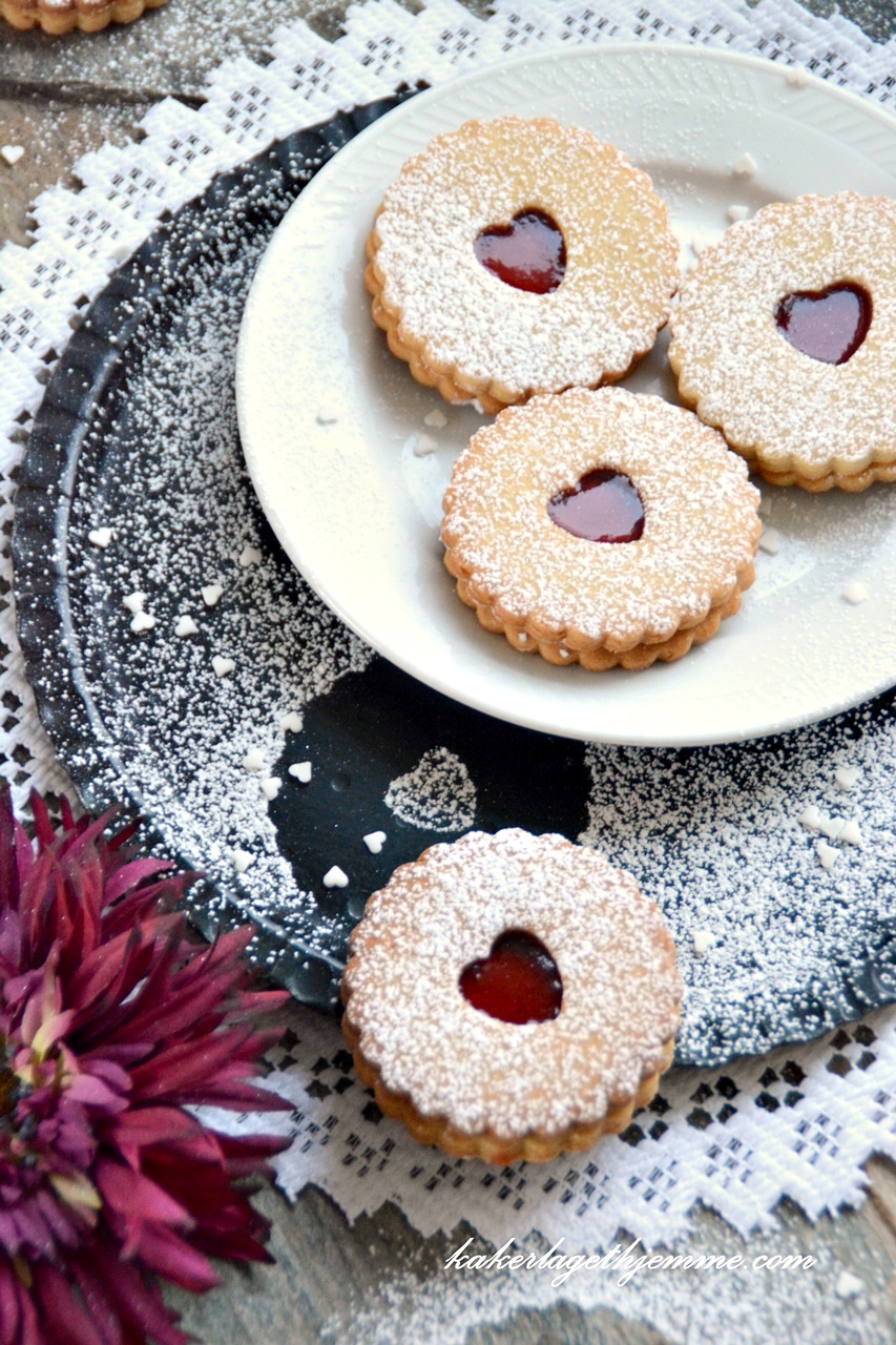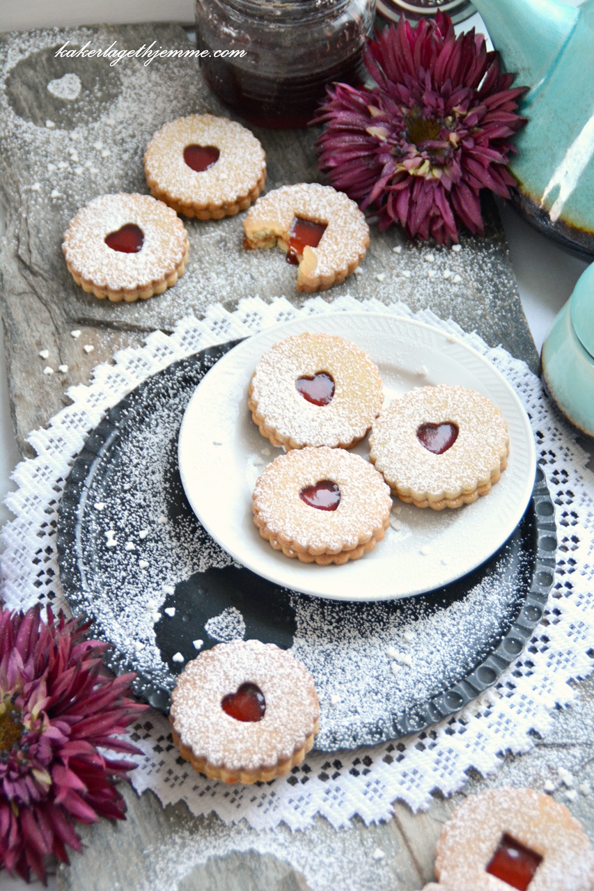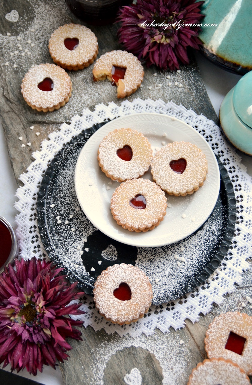 Etter at du har bakt alle dine kjeks og avkjølt de… drysser du alle dine kjeks topper (det blir de kjeks med for eksempel små hjerter kuttet ut i midten) med melis før du skal plassere hver av de oppå smurt med rød geleen eller syltetøy bunn.