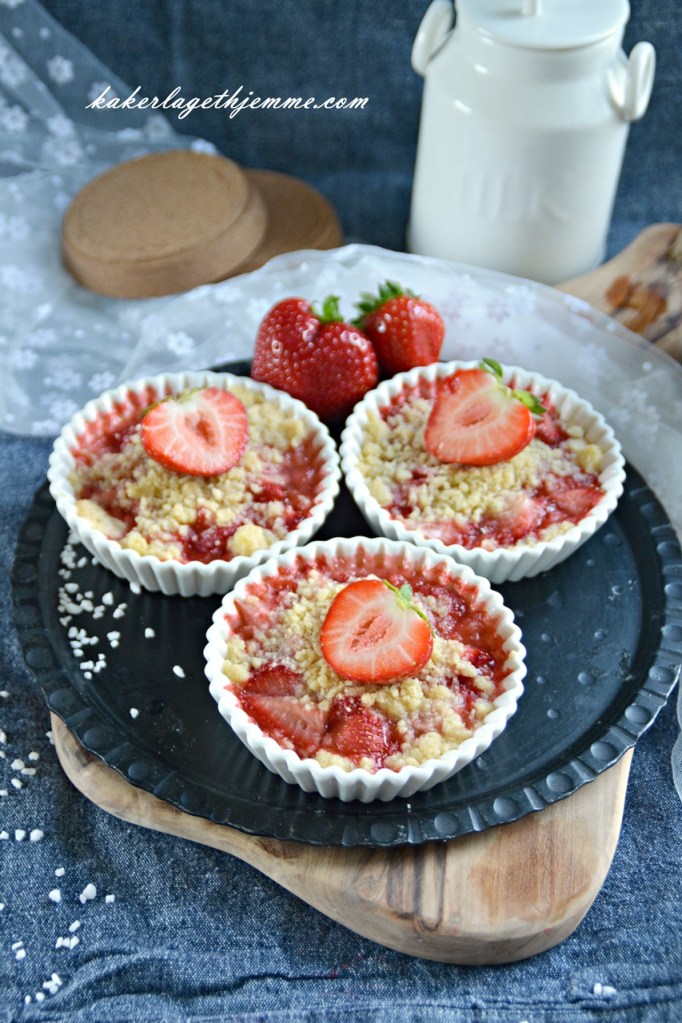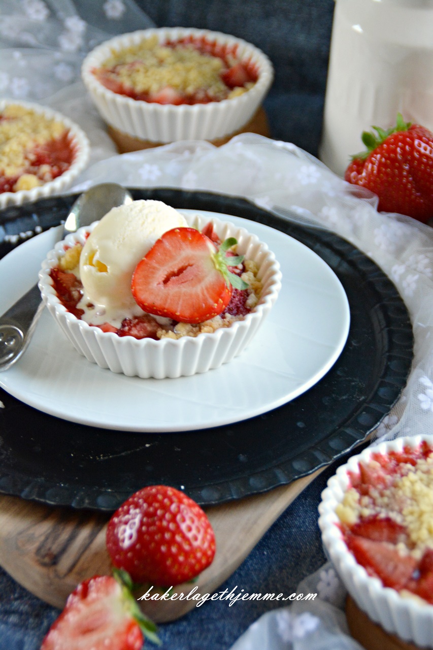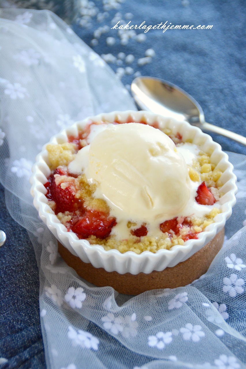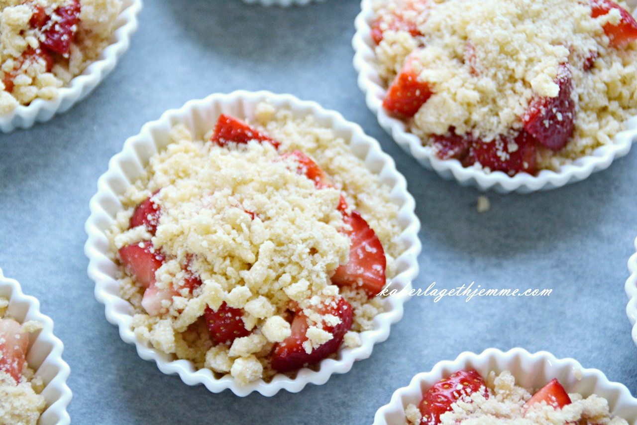Nå skal du legge til ca 2 ss skjæret jordbær oppå deigen og igjen en eller to smuldre deig oppå jordbærene.