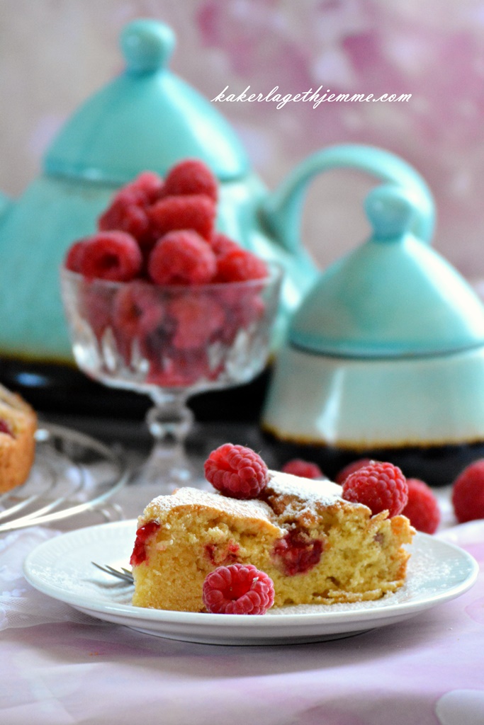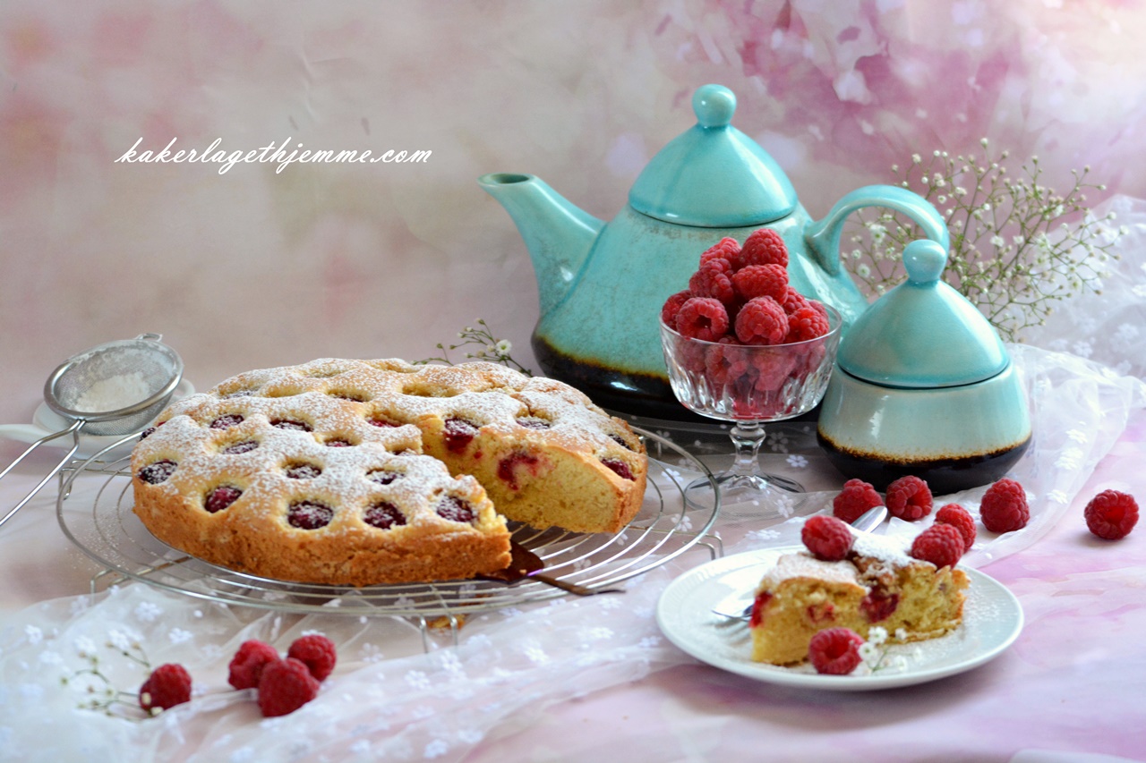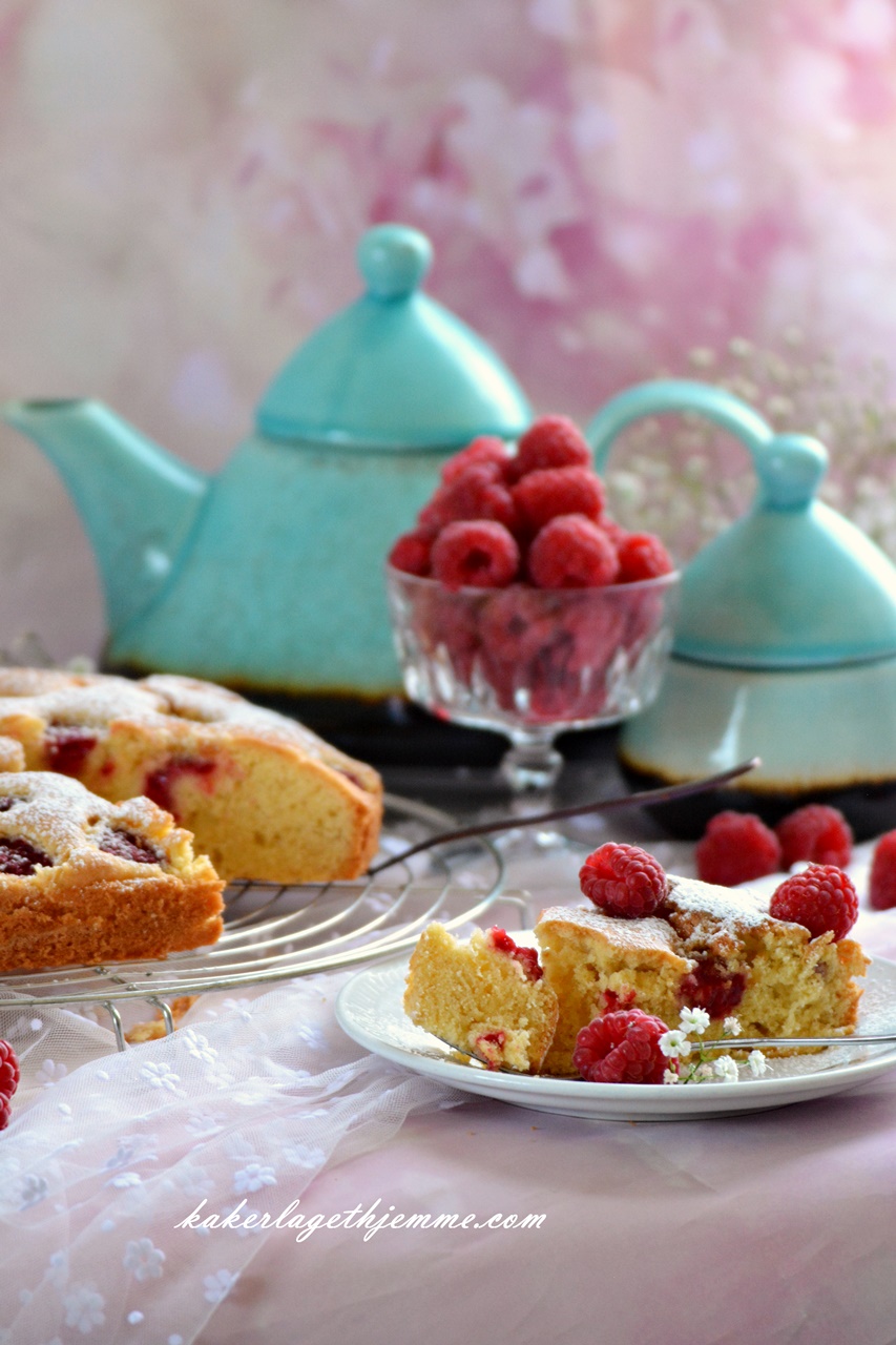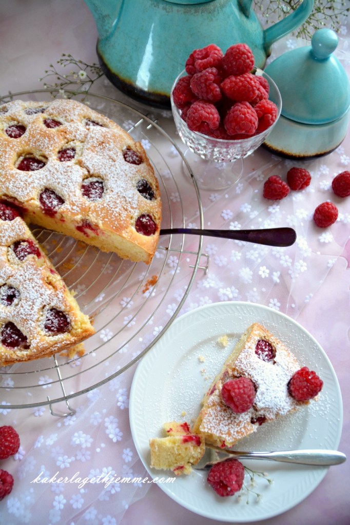 Kaken kan serveres med vanilje iskrem, rømme eller pisket fløte og ekstra bringebær.