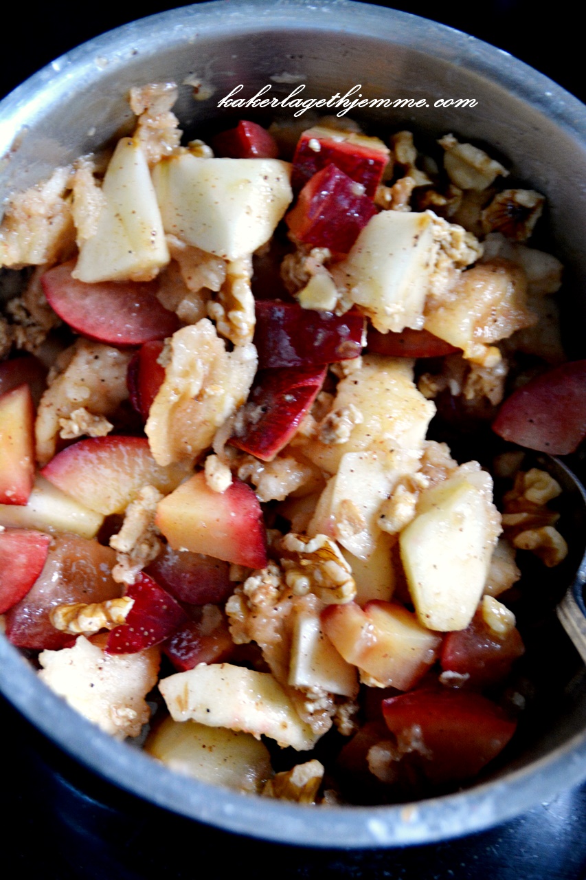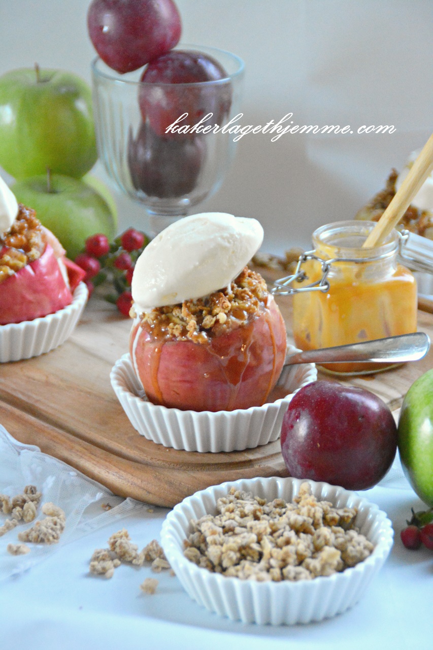 Hvis du vil ha noe deilig, ikke for søtt og samtidig hjemmelaget slik at du kjenner alle ingrediensene det er inni (ingen kunstigstoffer), prøv gjerne disse her bakte epler… en varm høstdessert laget med plommer, nøtter og granola og servert med karamell og litt iskrem for balanse mellom smaker og temperaturer… Jeg anbefaler det. Den ene tingen som er viktig her er at eplene skal være faste (som de grønne Granny Smith eplene for eksempel) og heller av den syrlige typen. Plommene jeg brukte var røde plommer, men du kan bruke den du liker best å spise, jeg er sikker på at de blir kjempegode… Tilsett litt brunt sukker og noen hakkede valnøtter, litt granola og bak mens du lager middag, og du har en perfekt, liten dessert som du kan servere til dine ettermiddagskaffen eller teen…