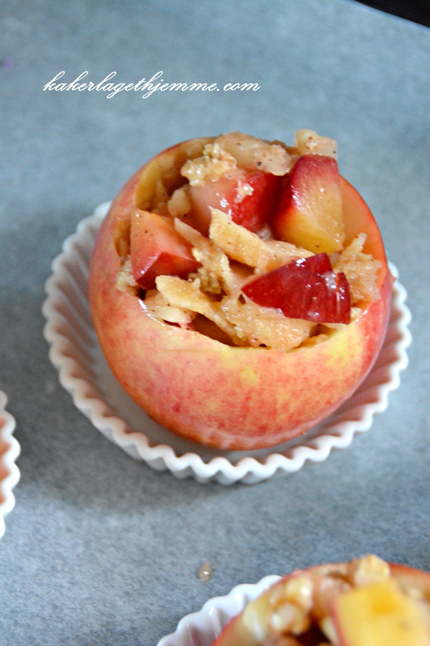 Plasser eplene i en ildfast form og fyll de med eple-plomme miks du har tilberedet tidligere… press forsiktig topper og så ha en skje med granola på toppen av hver eple.