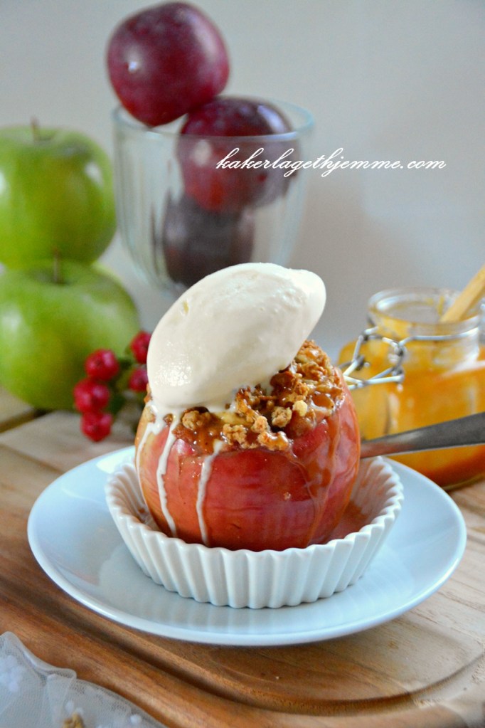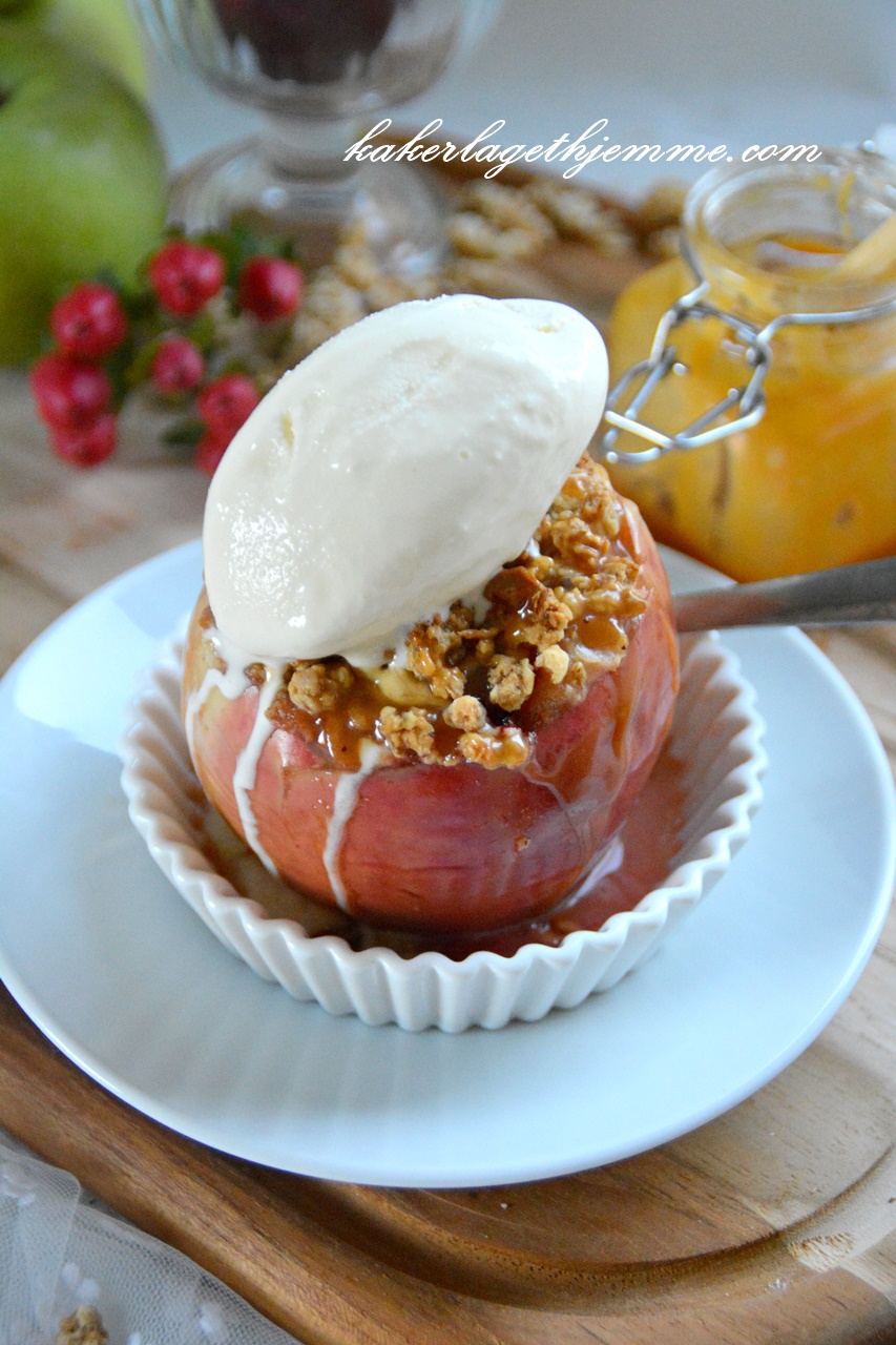Du skal bake eplene i ca. 20-25 minutter og etter den tiden server med dryss av karamell saus og en skje vanilje iskrem på toppen…