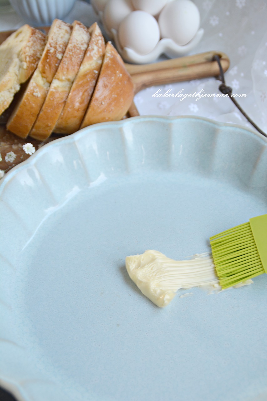 Først varm opp ovnen til 175 grader og smør formen som du skal bruke til å bake brødpuddingen med smør.