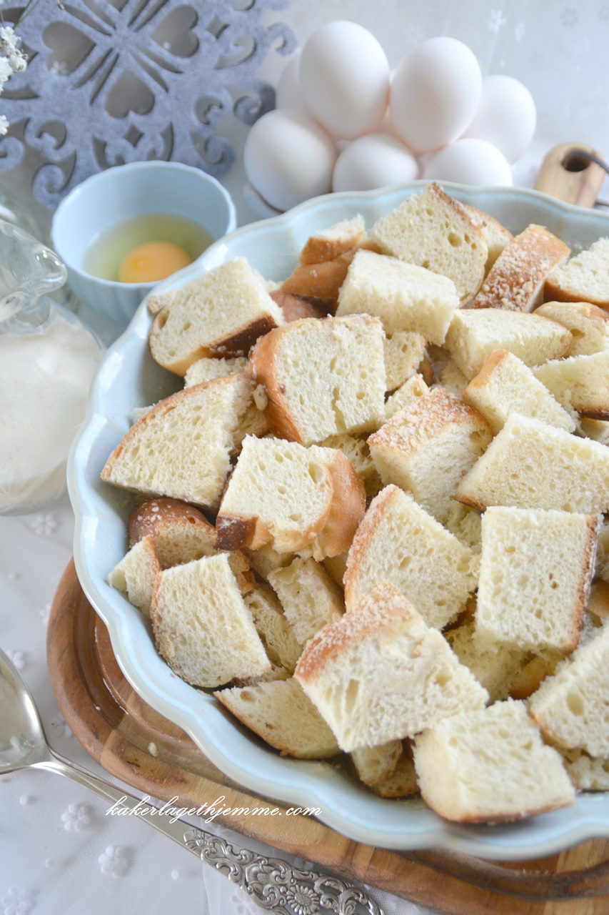 Skjær brødet i større terninger og plasser de i en ildfast form.