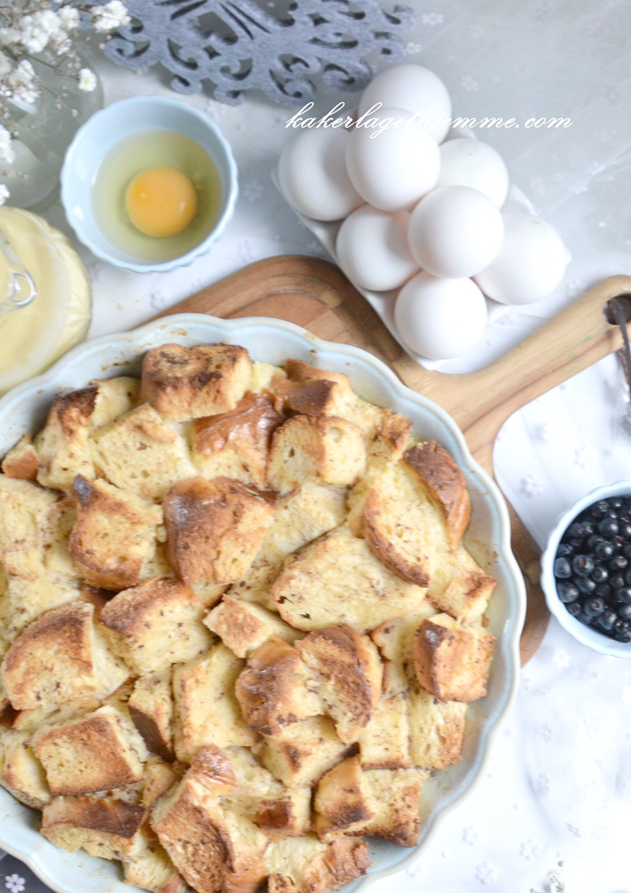 Hel egg og melk røren over brødet og la den stå i minst en halv time for at den skal trekke i seg så mye væske som mulig… pass gjerne på at alle brød terninger blir myke av å få i seg blandingen.