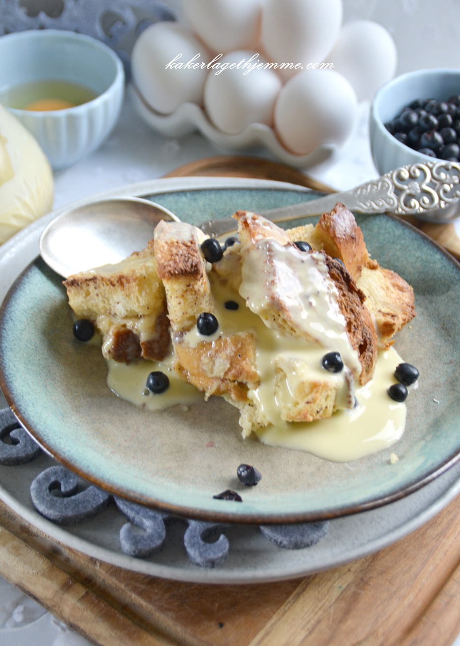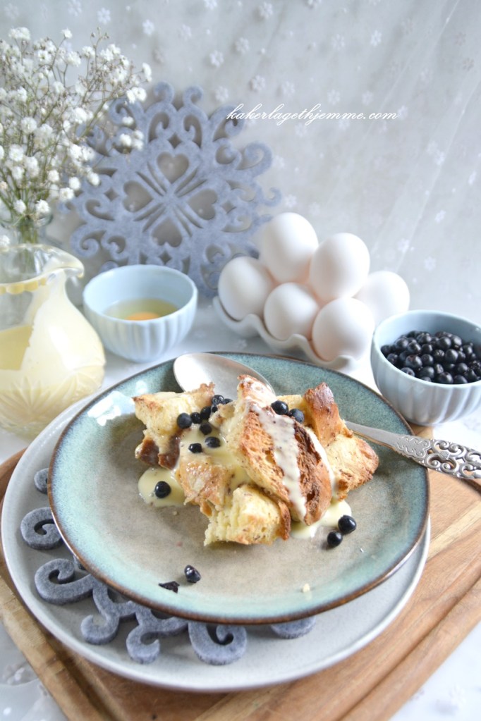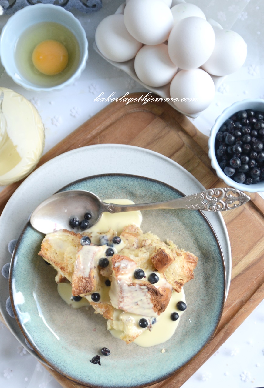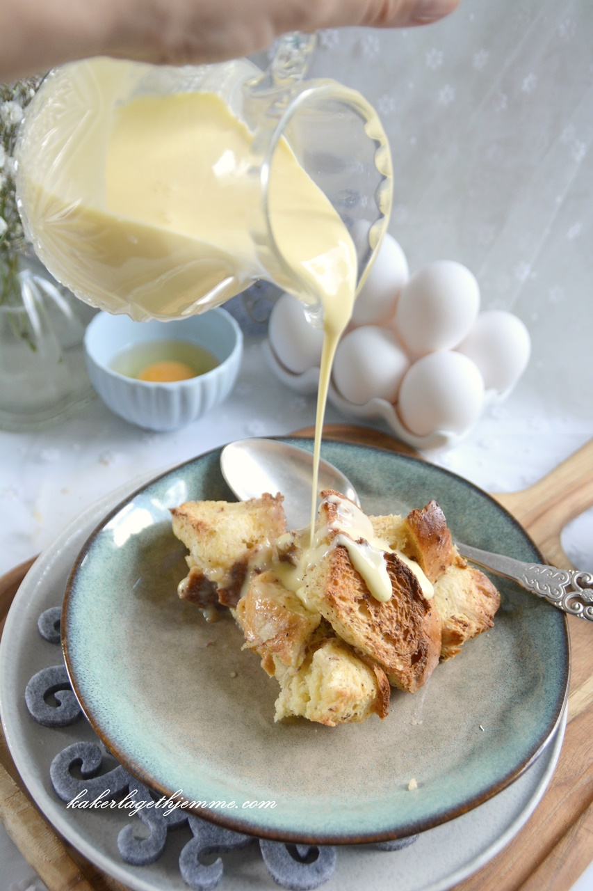 Brødpuddingen lages vanligvis når du ikke vil kaste brødet som er noen dager gammelt og ikke så ferskt lenger, så du gjør det om til noe varmt, søtt og klebrig som du kan ha til kaffen for eksempel… Best servert med hjemmelaget vaniljekrem og litt friske bær etter eget valg.