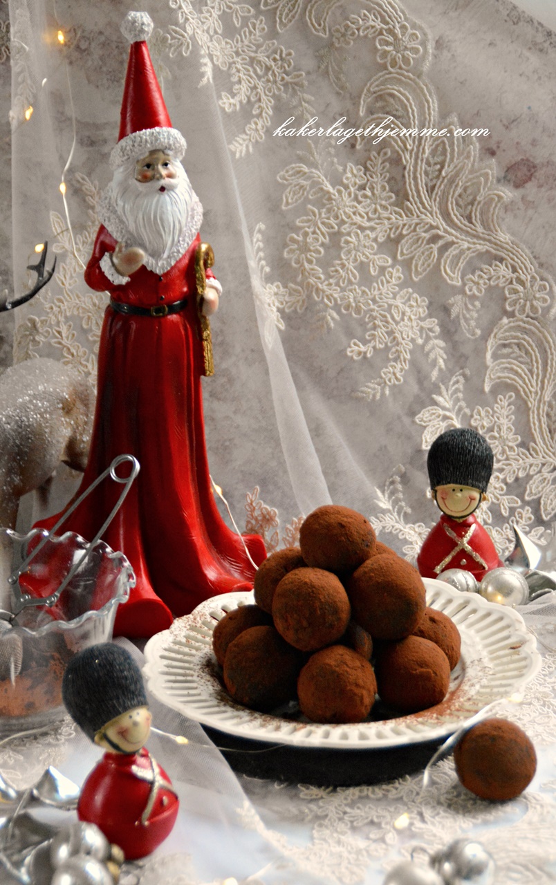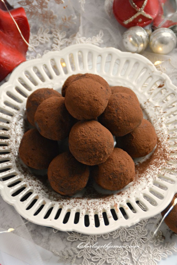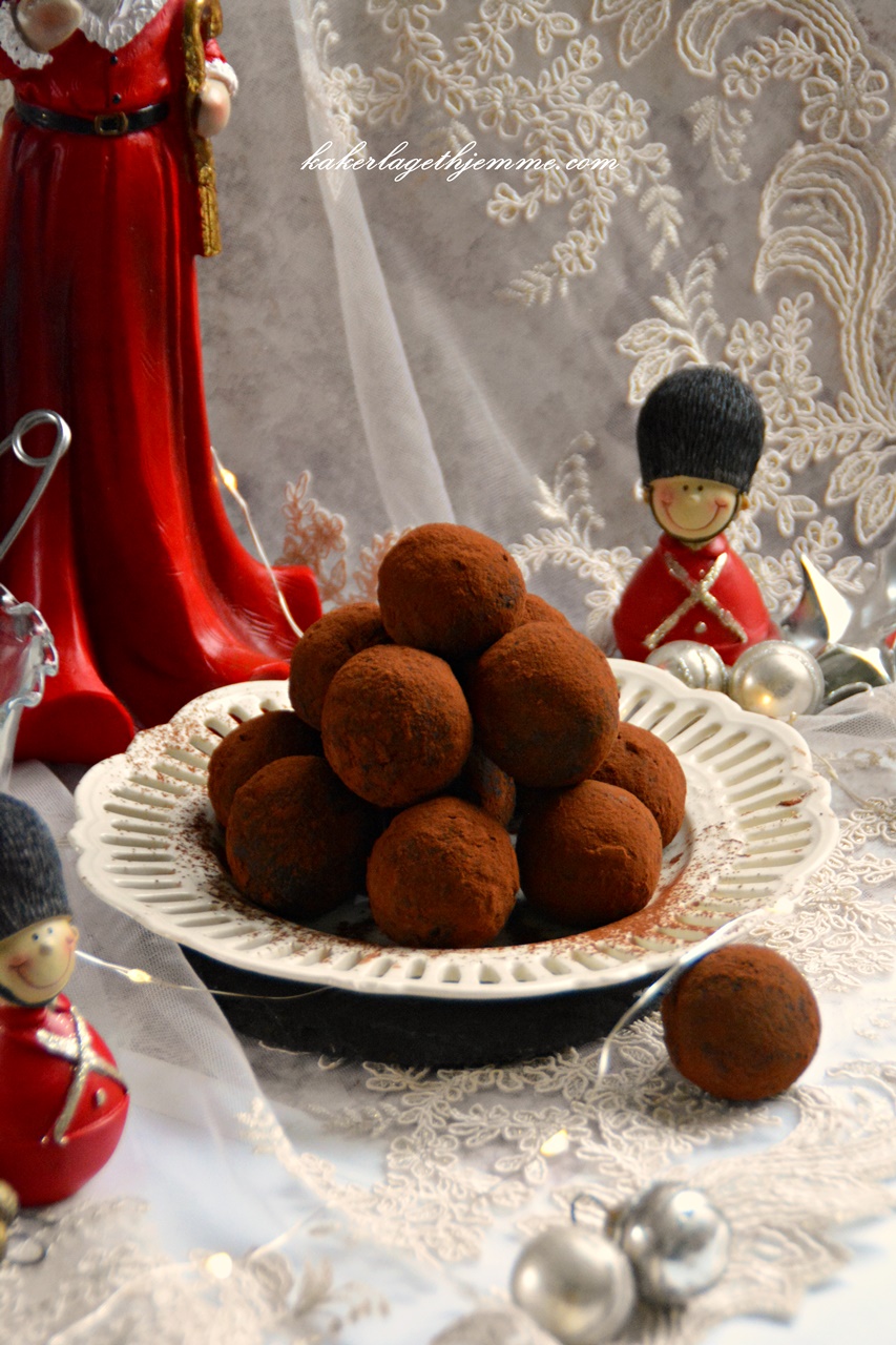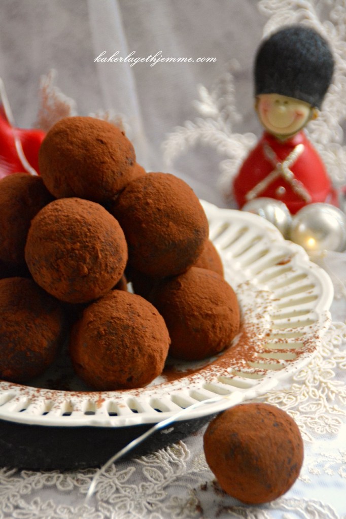 Når du er ferdig med det siste, skal du ha kakaopulveret i en mindre bolle og ha trøflene en etter en i, forsiktig rull dem rundt i bollen og når de er dekket med kakao skal du legge alle trøfler i kjøleskapet i minst et par timer eller en natt.
