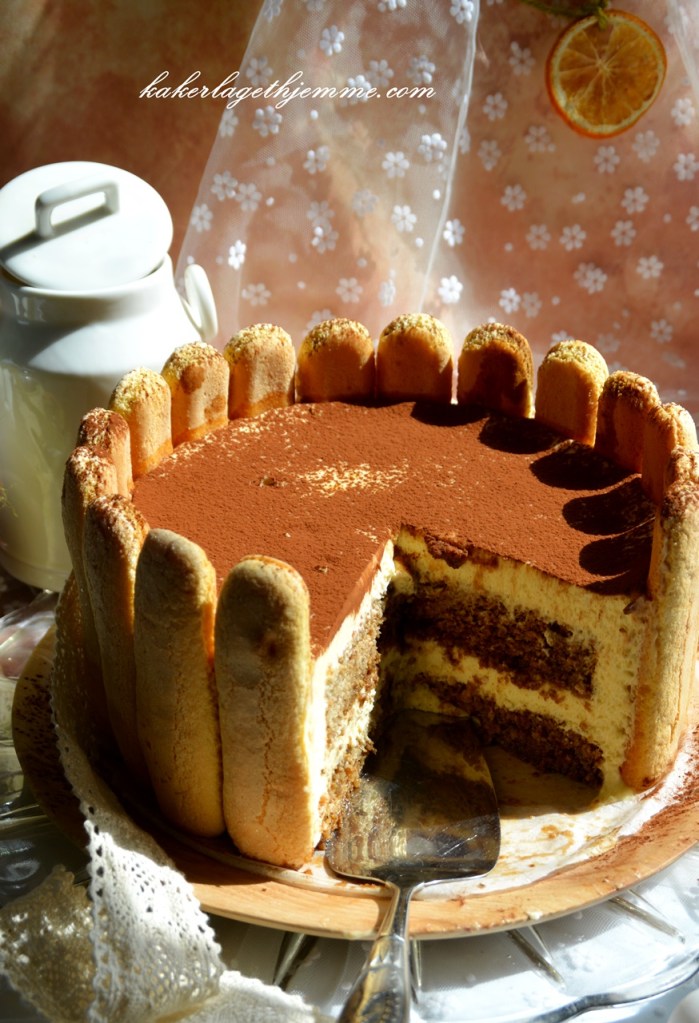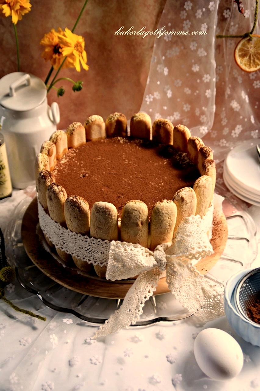 Jeg introduserer for dere valnøtt-tiramisu forkledd som noe helt annet, men innsiden av dette desserten kombinerer begge disse to «dynamikkene» som nøtteaktig smaken av valnøtt kake også søt, og sjokolade/kakao og espresso-punch av tiramisu… alt pakket i sjarmerende form av charlotte med de karakteristiske for denne desserten såkalte «Ladyfinger» kjeks rundt den, akkurat slike vi selvfølgelig også pleier å bruke når vi lager klasisk tiramisu. Jeg har også pyntet desserten med en vakker, rustikk sløyfe som jeg bundet rundt kaken for den ikoniske charlotte utseende.