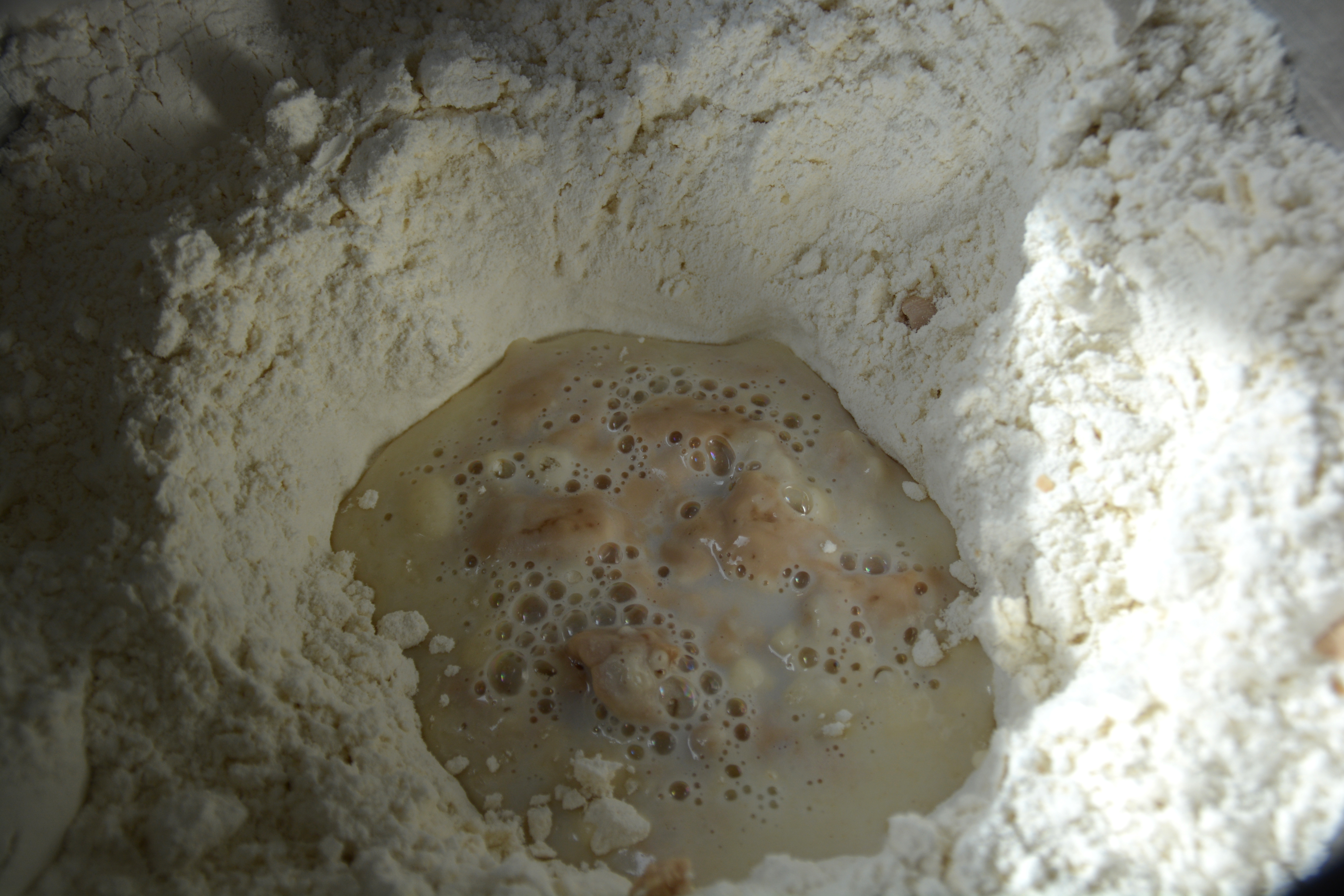 I bollen av en kjøkken maskin bland sammen 2 kopper hvetemel, tørr gjær, 1/4 kopp sukker og salt. Tilsett egg og melkeblandingen til melblandingen og fortsett til grundig kombinert.