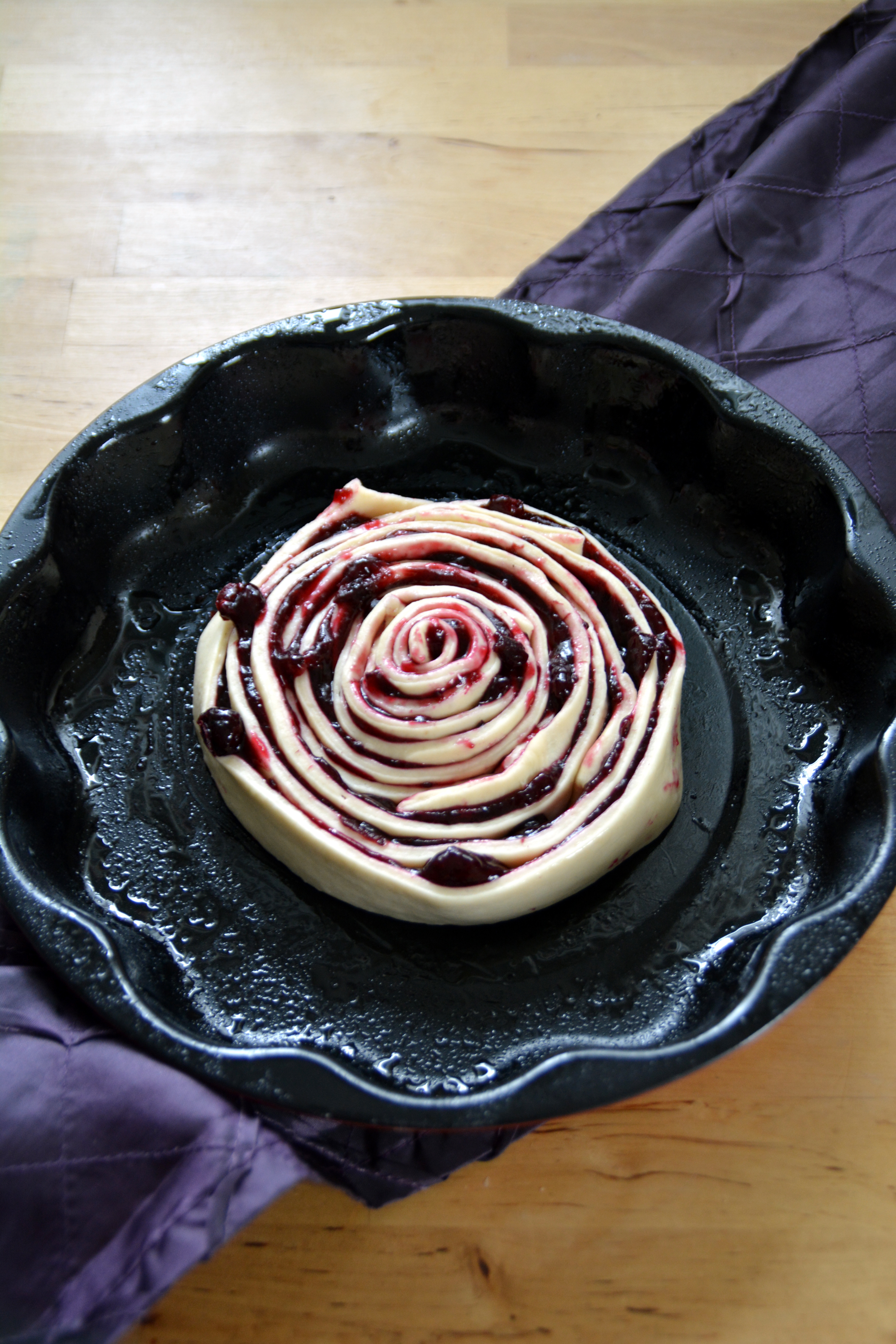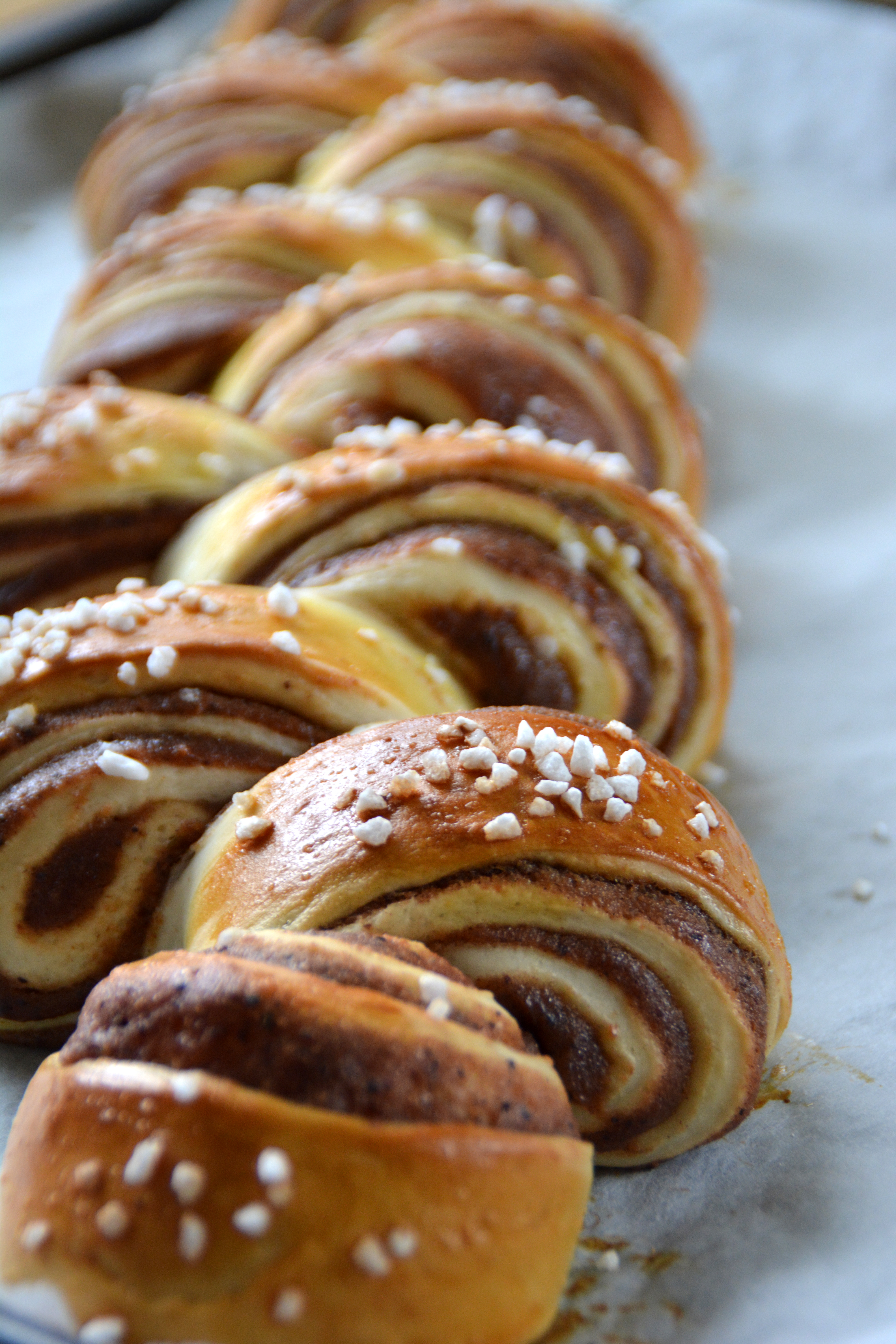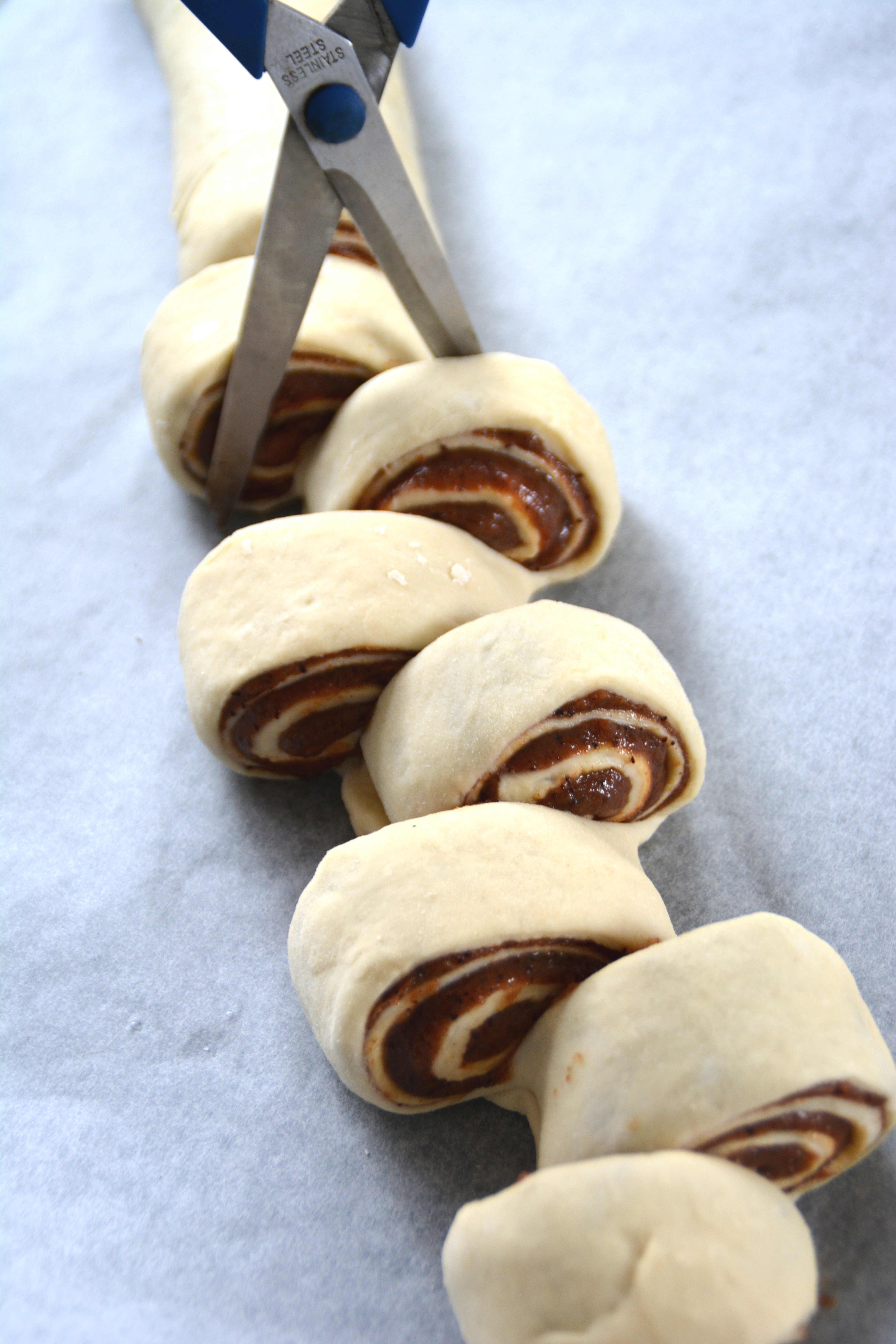 Rull deigen i rulle langs den lange enden. Skjær i 10-12 like skiver.
