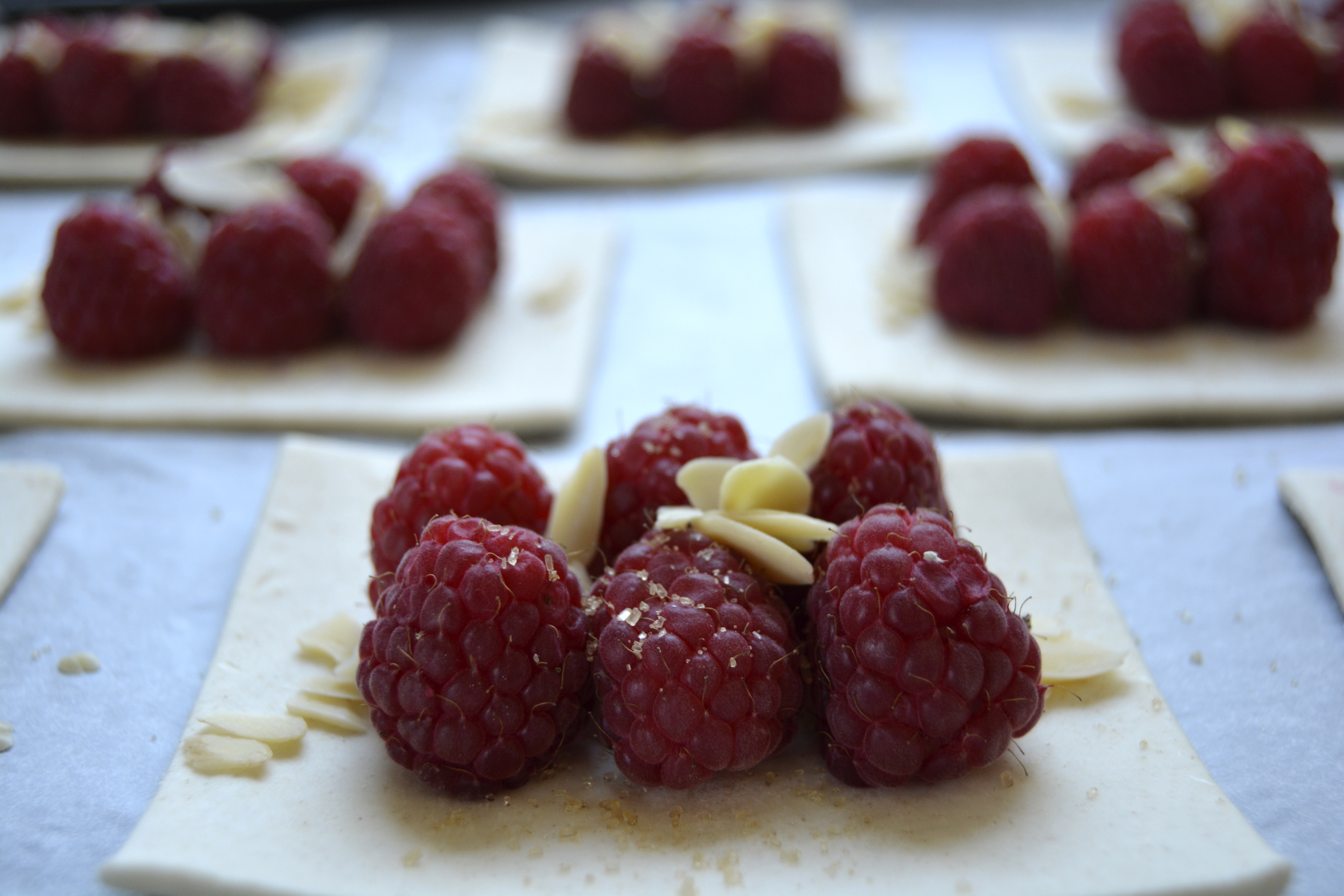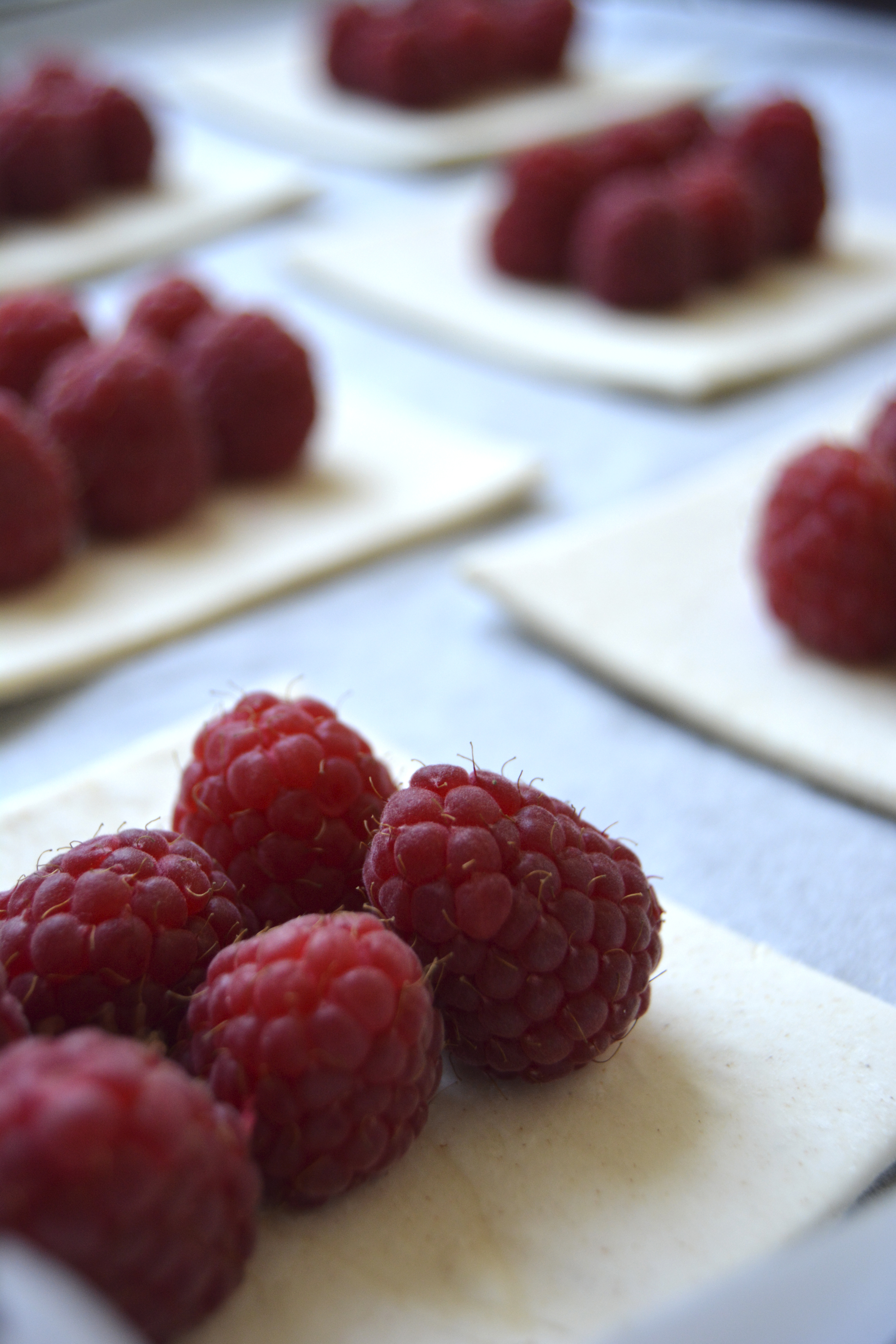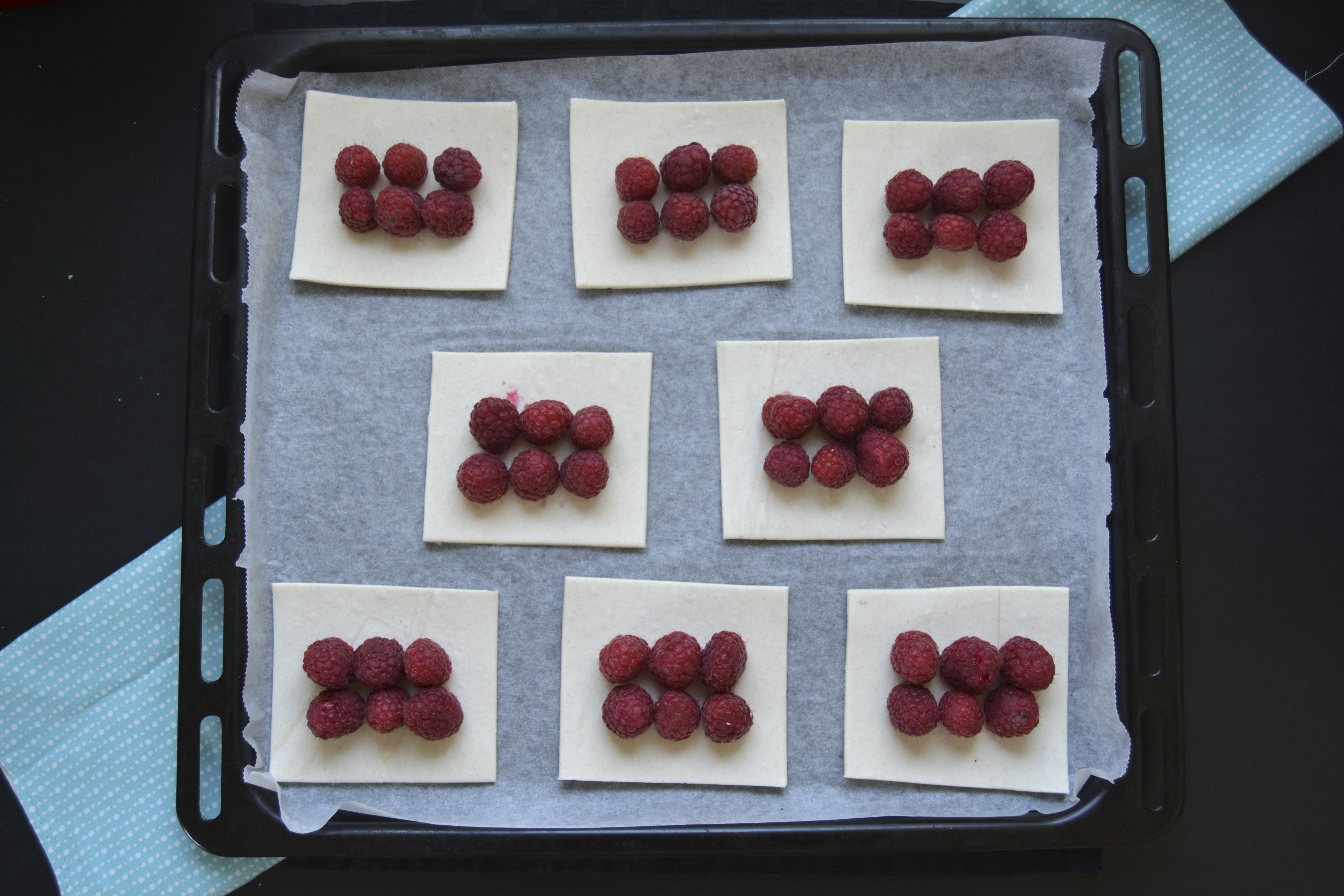 Spre kremost fylle jevnt over deigen. Dryss med bringebær.