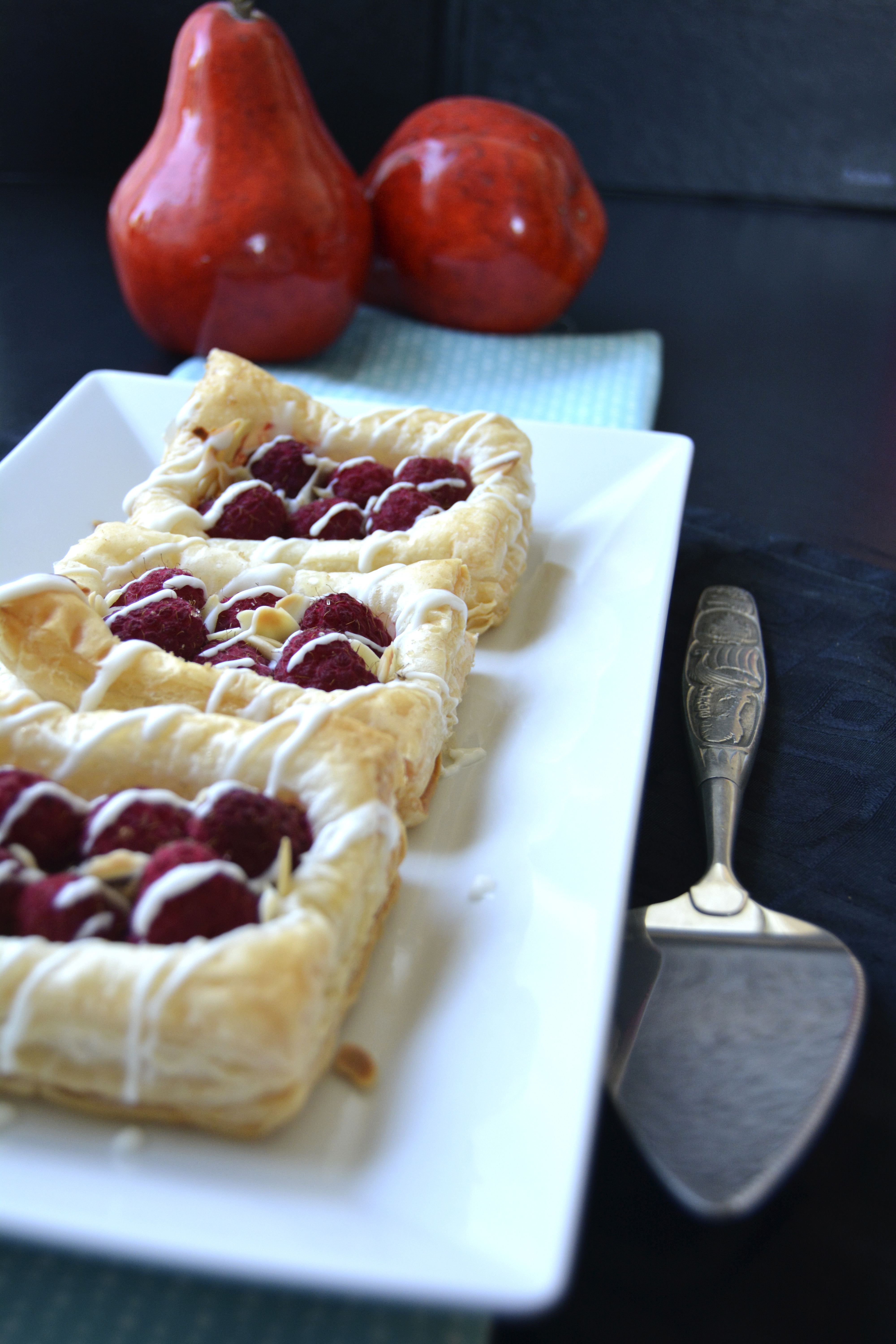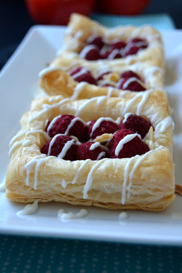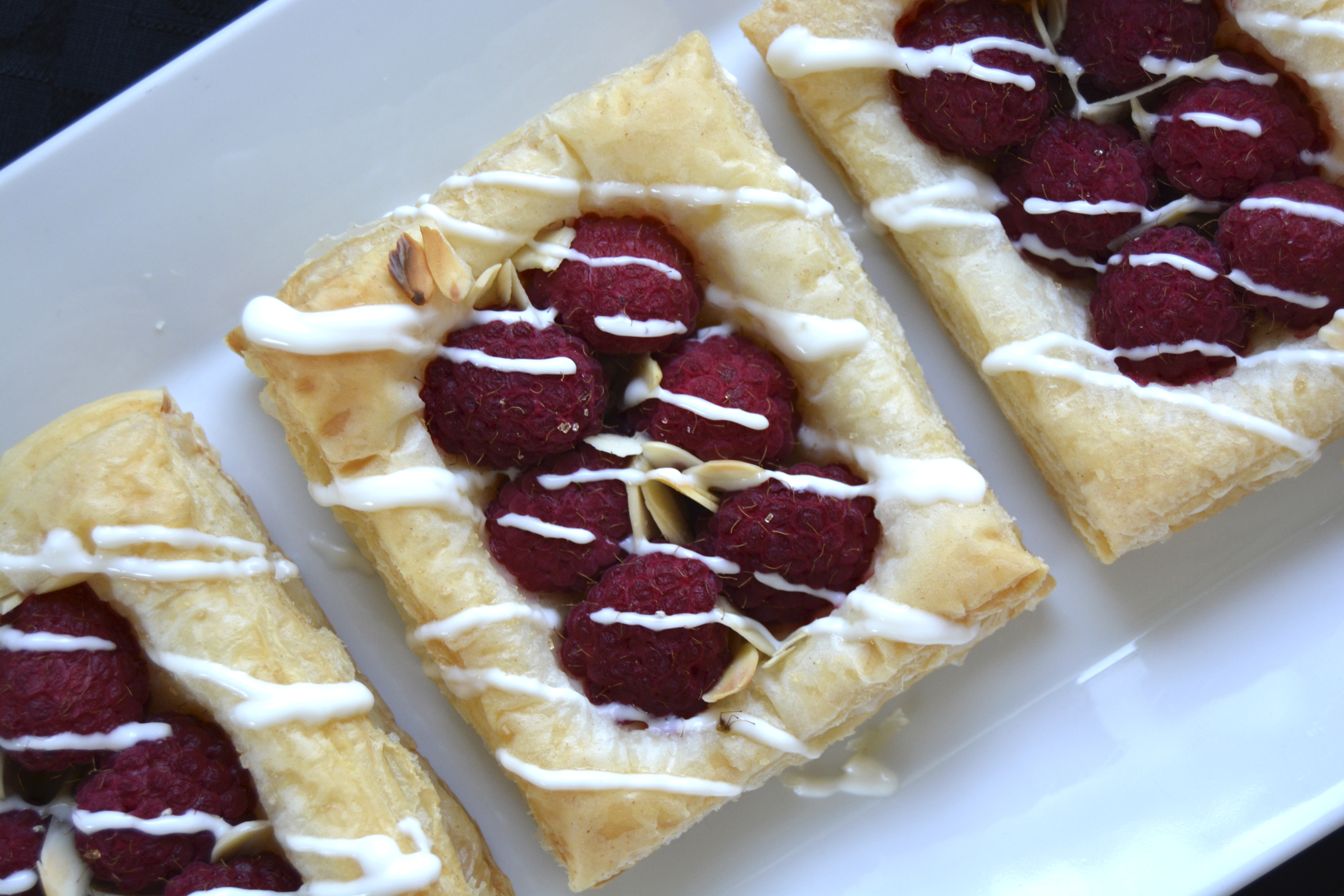 Spre kremost fylle jevnt over deigen. Dryss med bringebær.