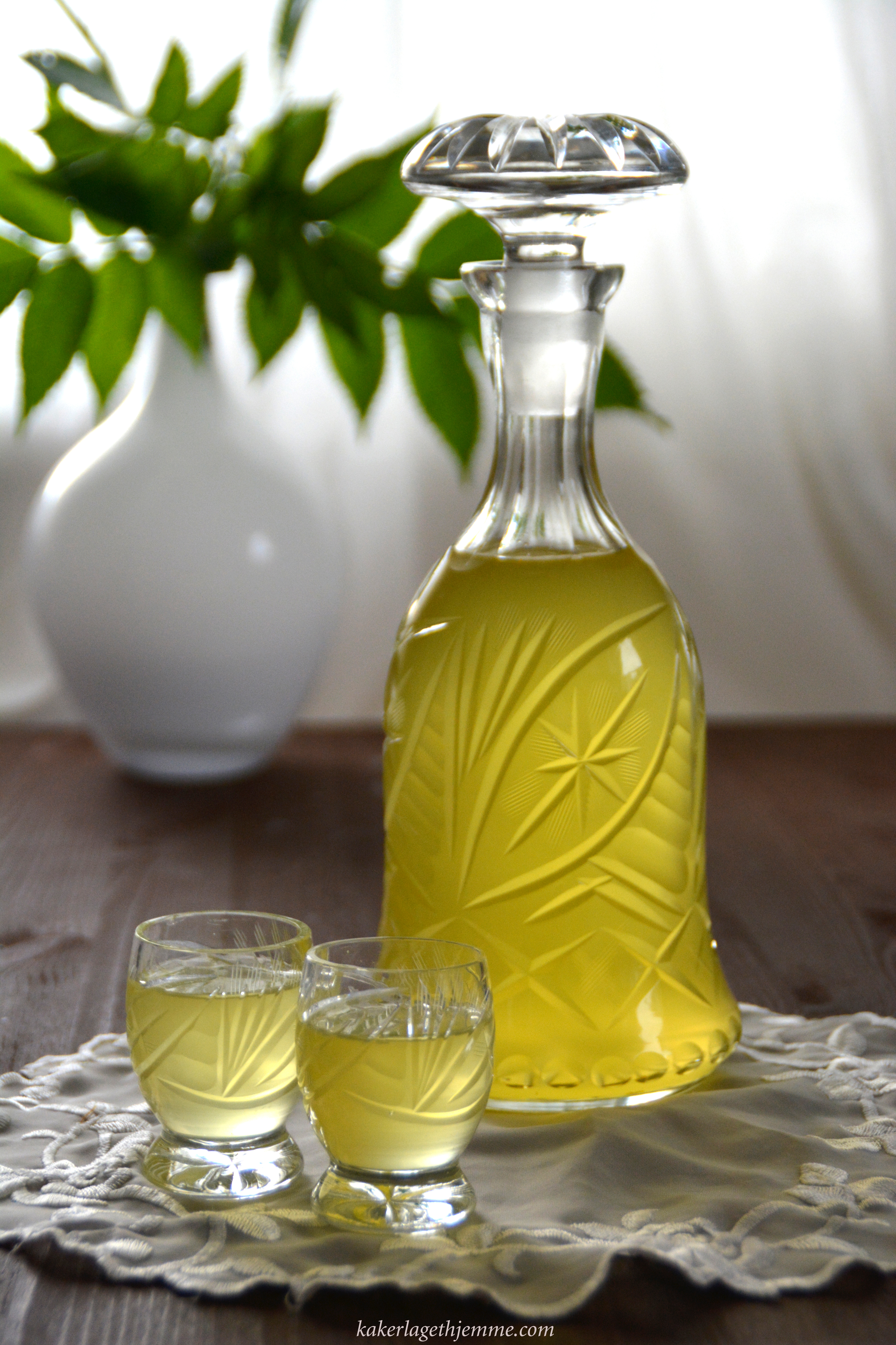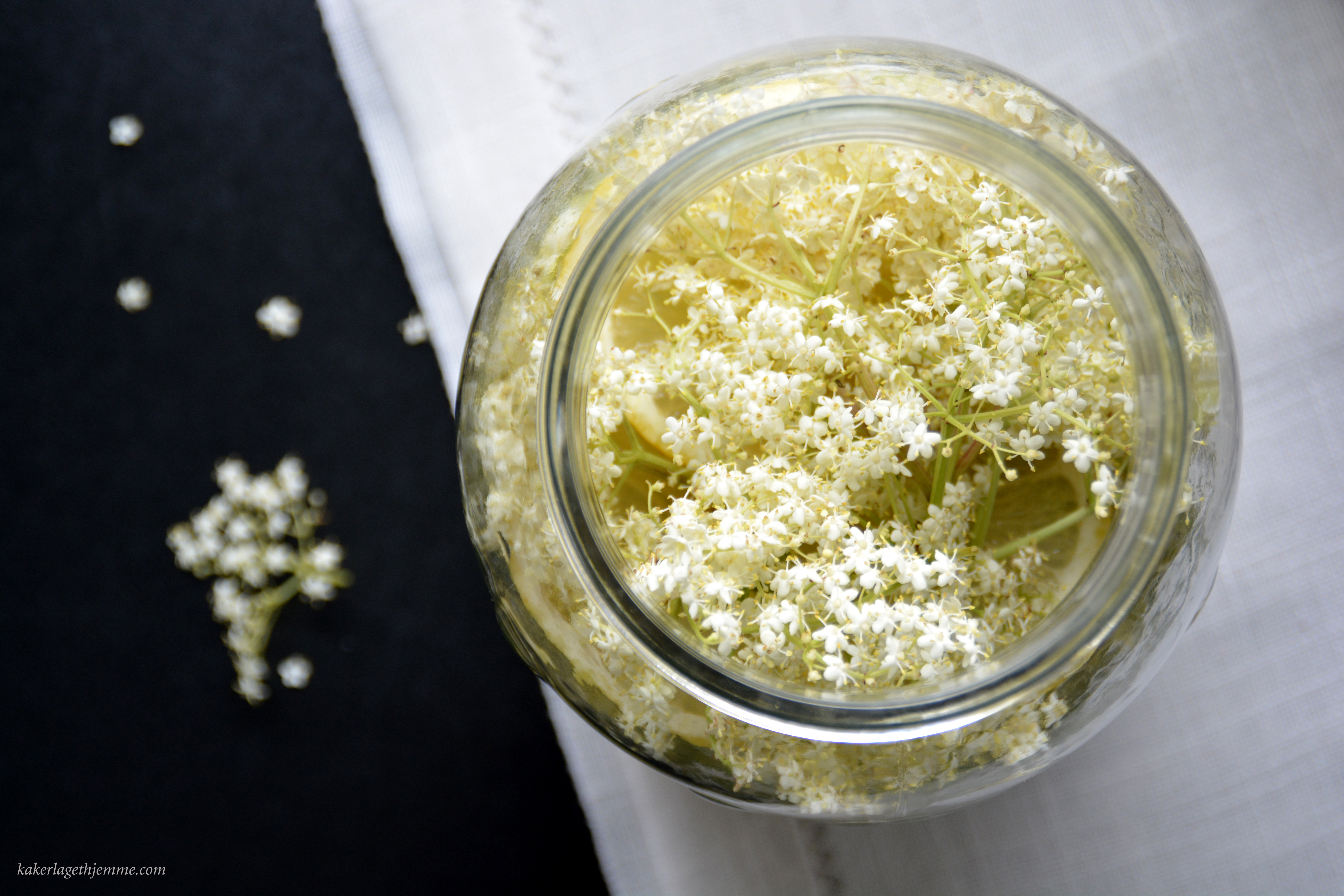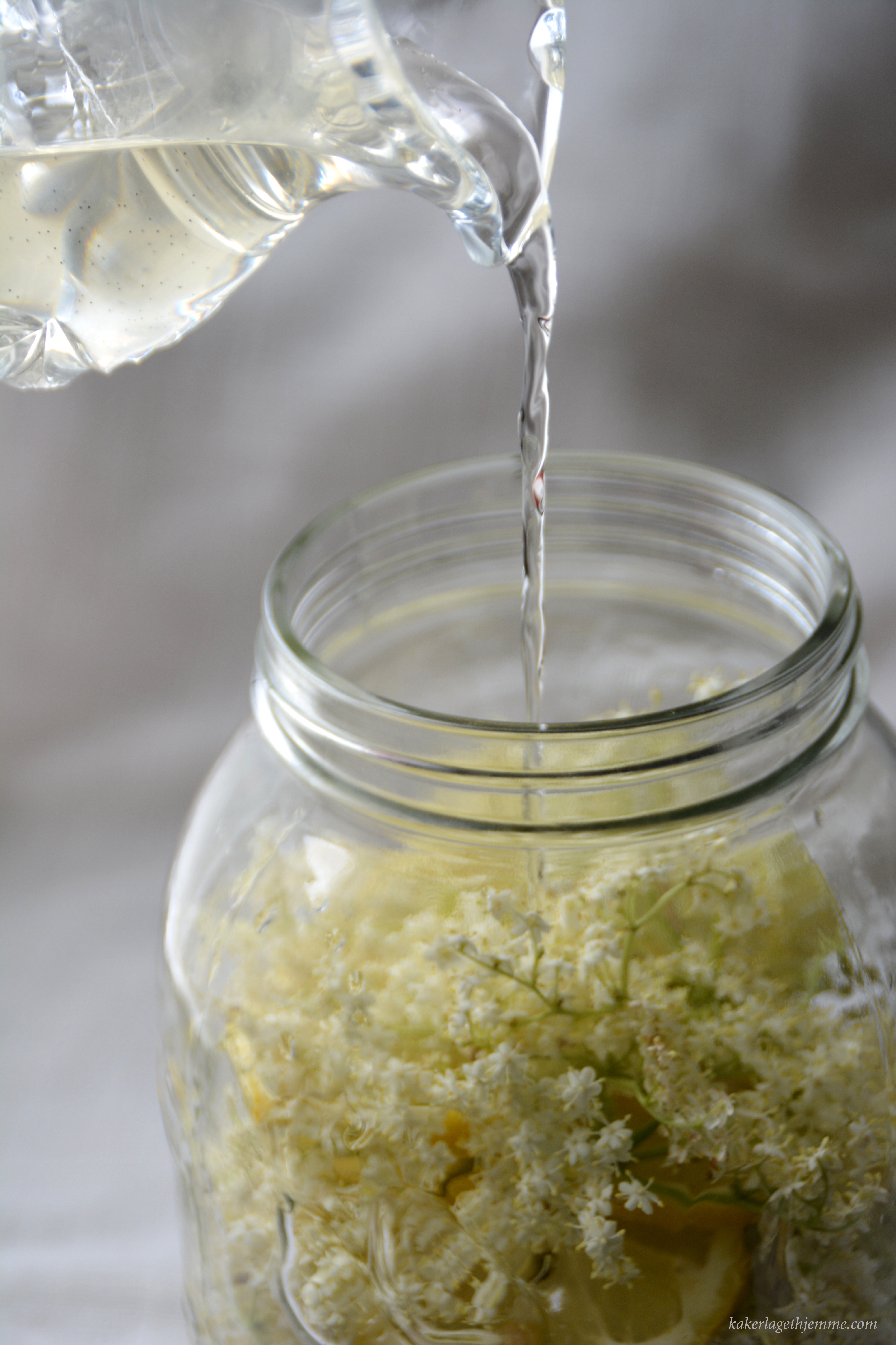 Etter 5 dager hell hylleblomst sirup som nå har smaken og lukten av sitron og hylleblomst gjennom sil foret med gasbind, bland det med alkohol.