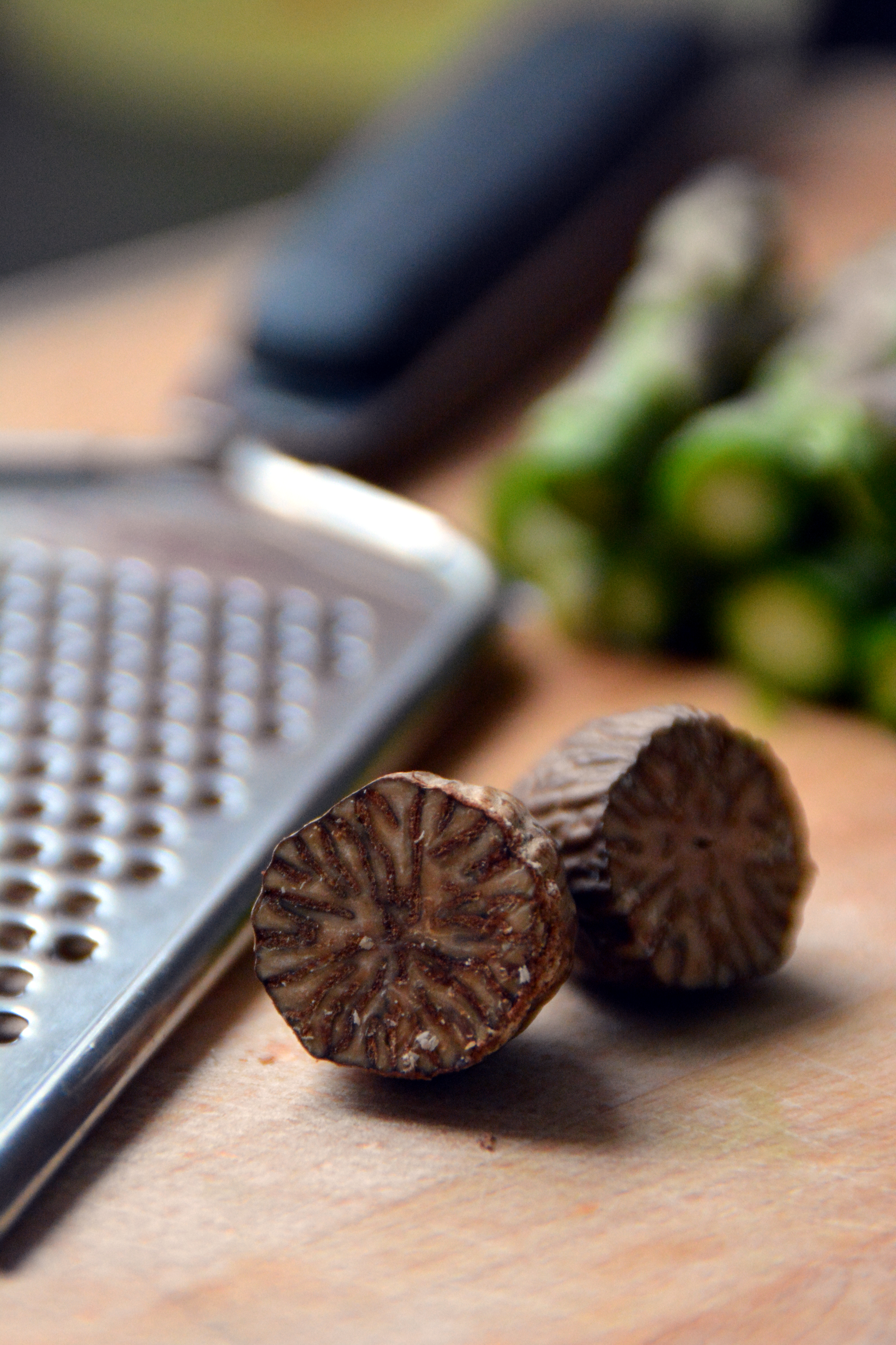 Krydre med salt, pepper, cayenne pepper og muskat nøtt og blend. Hell i buljongen og kok opp. Kokk i ca. 5 minutter, tilsett aspargeshoder og kok i ytterligere 5 minutter.