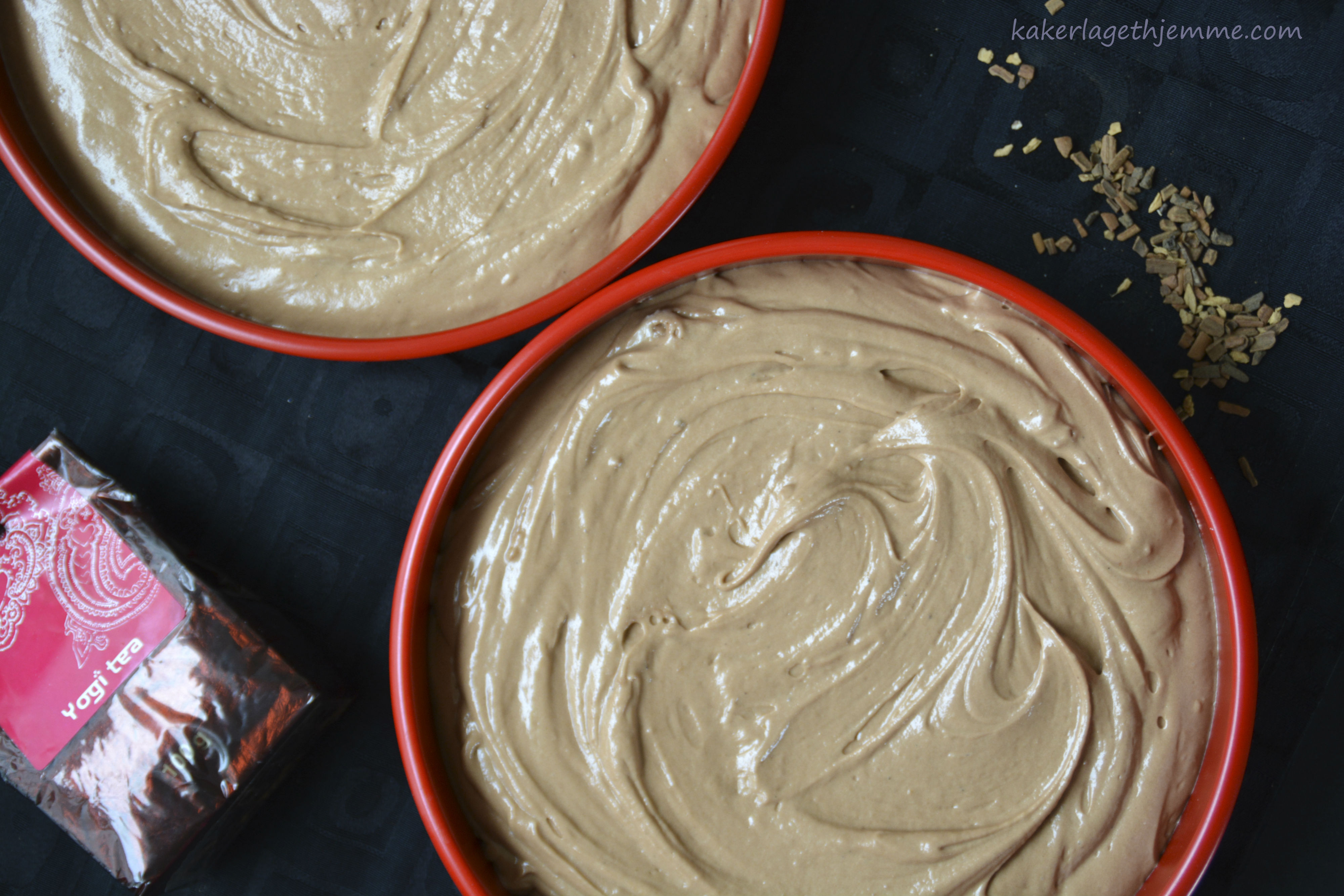 Hell røren i to, foret med bakepapir, 20-21 cm i diameter kakeformer og stek ved 160-170 °C i 35-40 minutter eller til en tannpirker satt inn i midten av kaken kommer ut ren. Ta ut av ovnen og avkjøl.